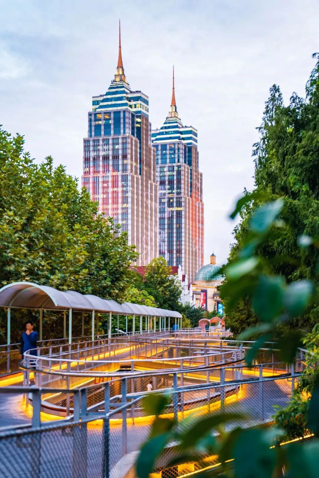 从昌化路桥下中远两湾城小区旁的步道启程,夜跑就此开始。天安千树的立体绿植在灯光映射下如悬浮森林,成为跑步途中不断向后流动的背景。光影勾勒出昌化路桥的双拱,不仅是视觉地标,也为跑者提供了清晰的距离参照。