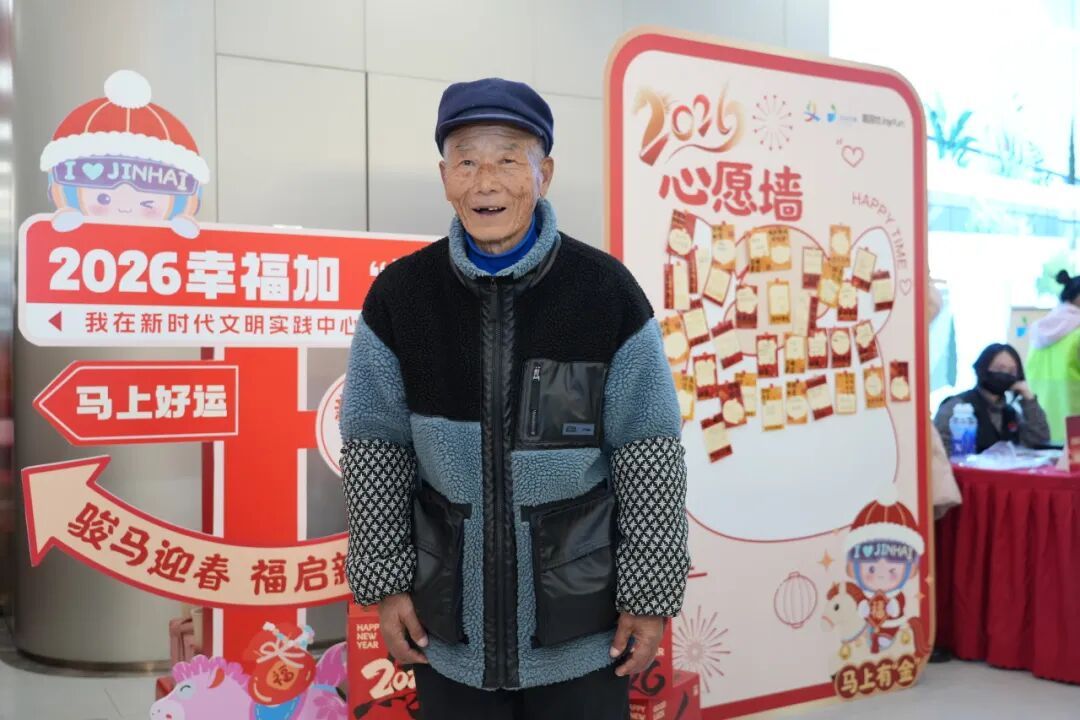 “爷爷奶奶看镜头,笑一个!”金海“拾光”新时代文明实践志愿服务队打造的新春摄影区,专为60岁以上市民送上暖心福利。