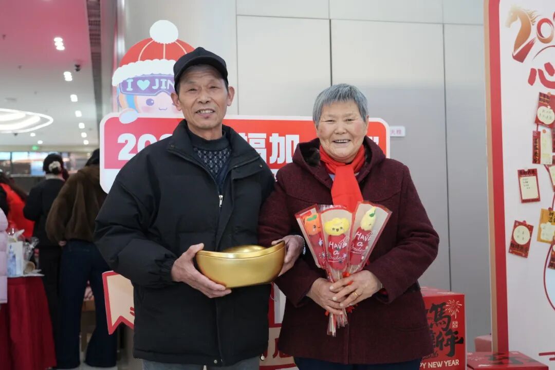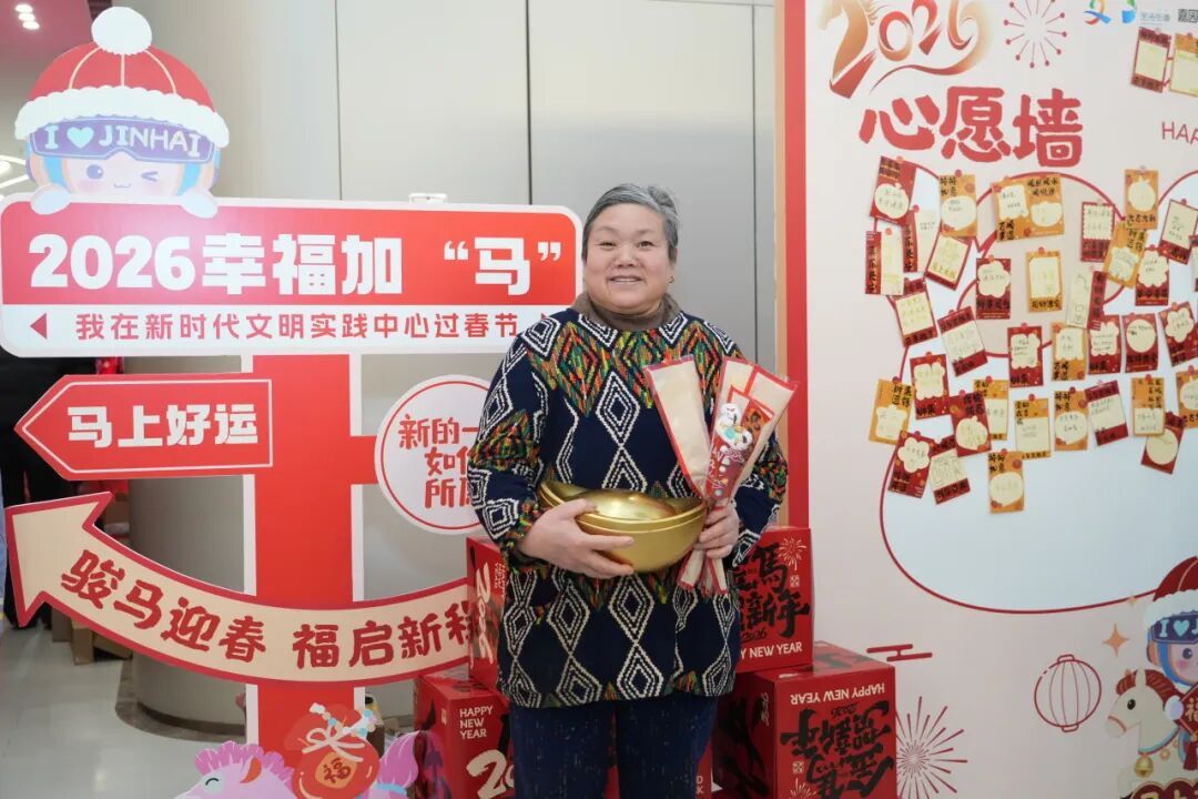 “春联最初的名称是什么?”“马在十二生肖中排第几位?”民俗互动区里,春节习俗、生肖文化、趣味灯谜轮番上阵,居民们踊跃抢答,现场气氛热烈非凡。答对题目即可解锁金海定制国潮文创礼品,大家在轻松有趣的互动中深化了对中华传统文化的认知,让年味在益智游戏中愈发浓厚。