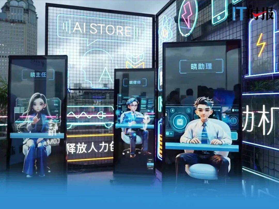 展厅里,五彩斑斓的“AI货架”展示了多款AI STORE深度赋能业务的“拳头产品”:比如,可以让文档变知识的“晓悟”企业智能知识库、将招聘效率提升300%的“晓招聘”智能招聘助手,以及随时随地可办公的“AI云电脑数字工位”……
