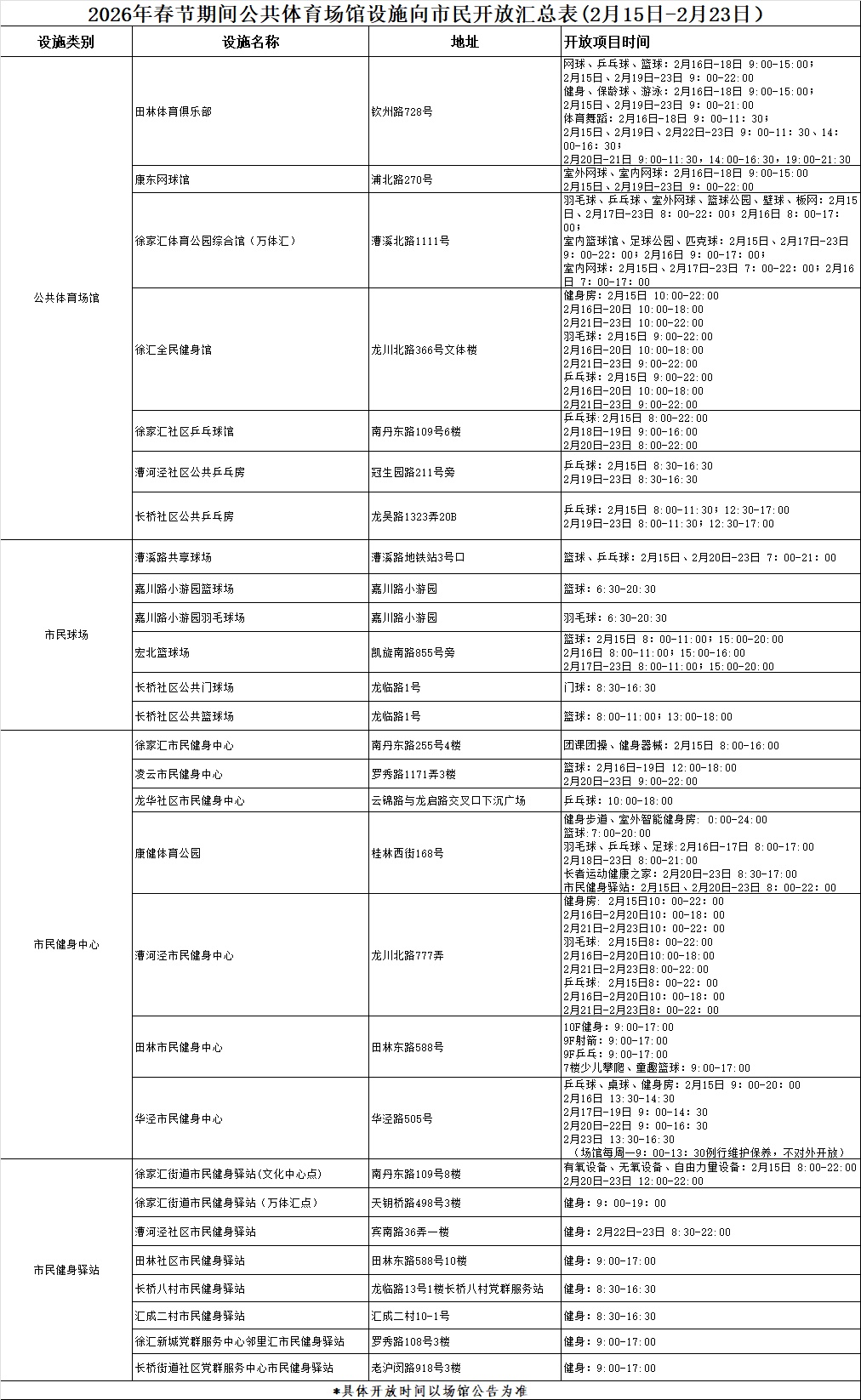 具体场馆开放表