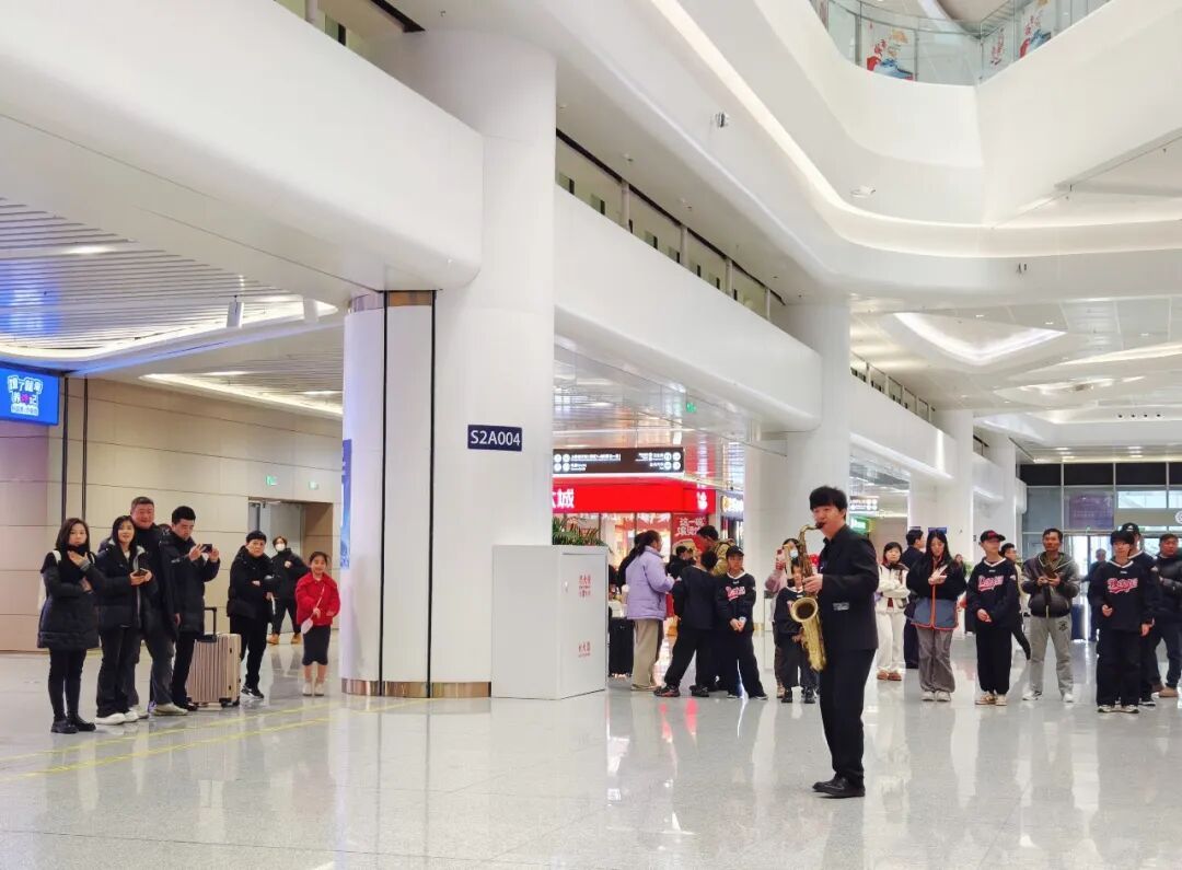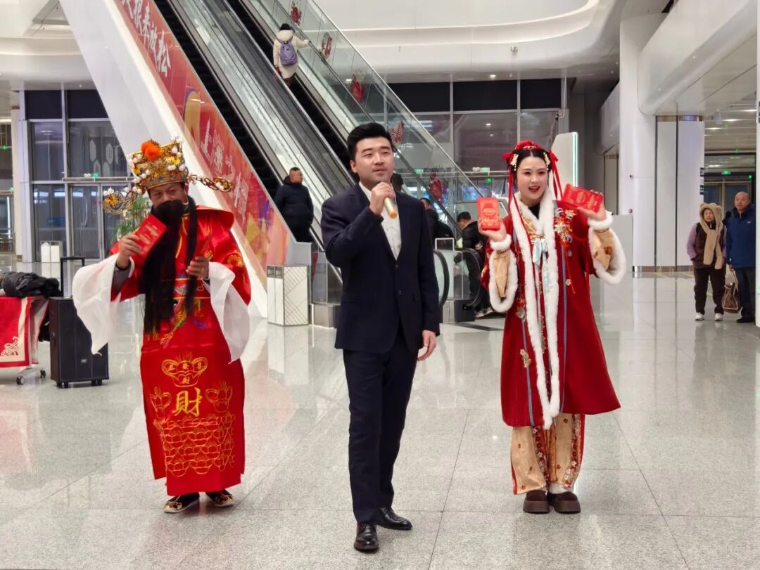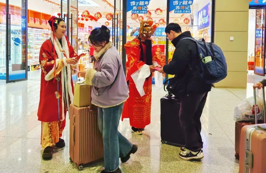 现场文艺氛围同样热烈。少儿街舞、金曲联唱、萨克斯演奏等国潮快闪不定时上演,引得旅客驻足围观、齐声合唱;“财神”巡游派送的“马年红包”惊喜不断,内含商户优惠券、“符号松江”文创贴纸、新春祝福语等小礼品,深受旅客欢迎。