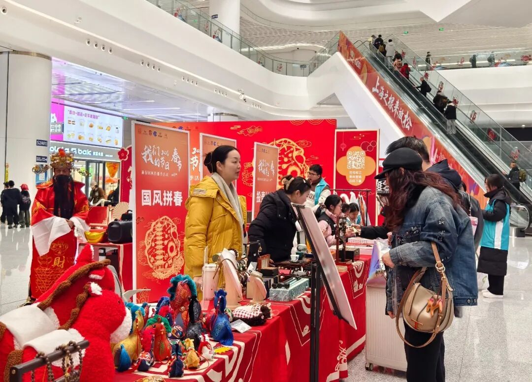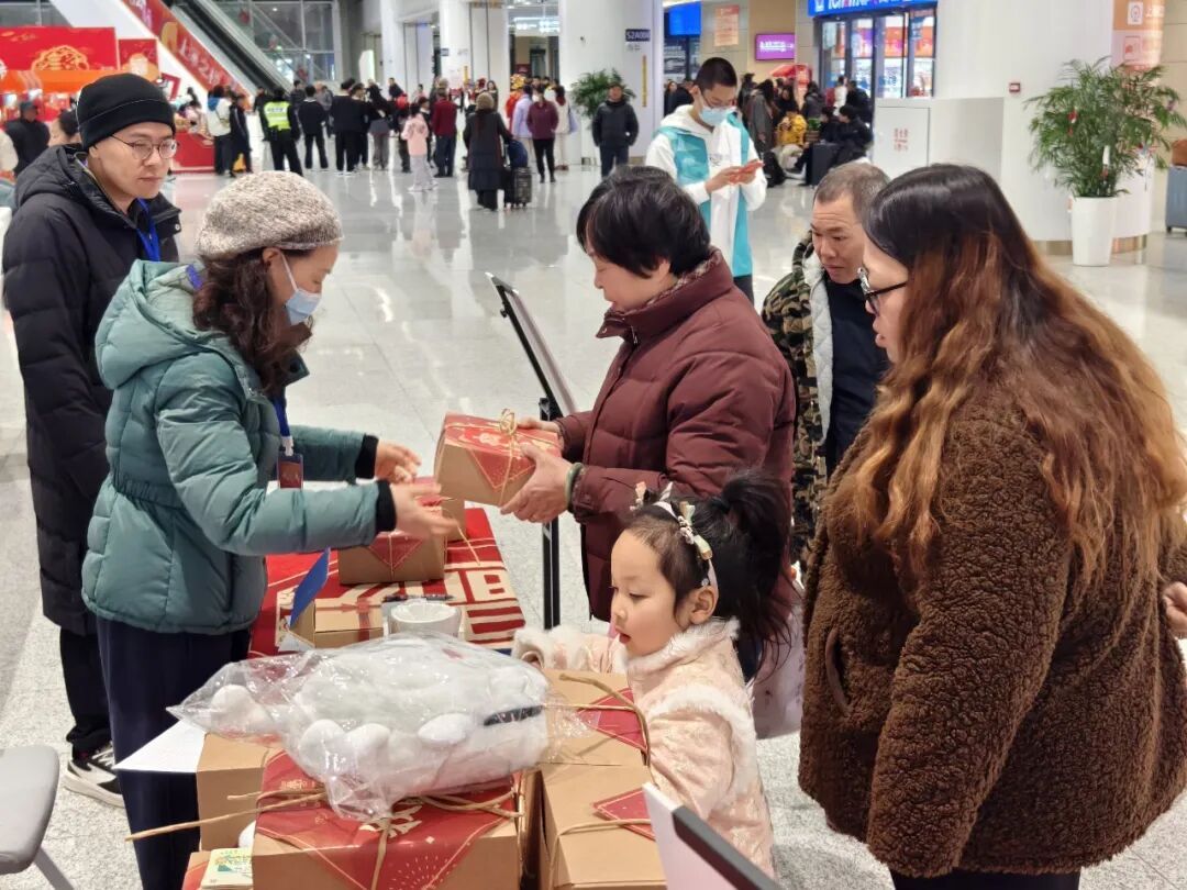 主题打卡区旁,“国风拼春”“华裳映春”“投壶纳福”等互动游戏人气火爆。旅客手持集章卡,参与地标拼图、传统投壶、汉服体验等项目,集章成功即可兑换定制年货礼包,把年味与祝福带回家。