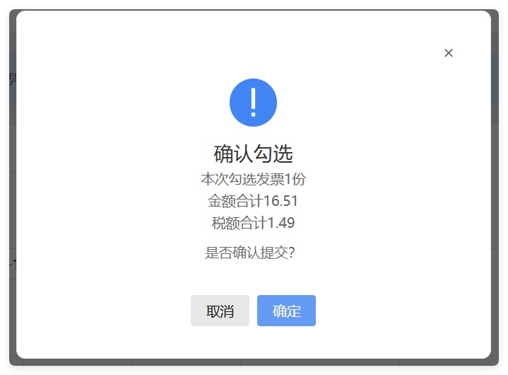 选择符合抵扣条件的铁路电子客票信息,点击【提交勾选】按钮,点击【确定】后提示成功即完成操作。