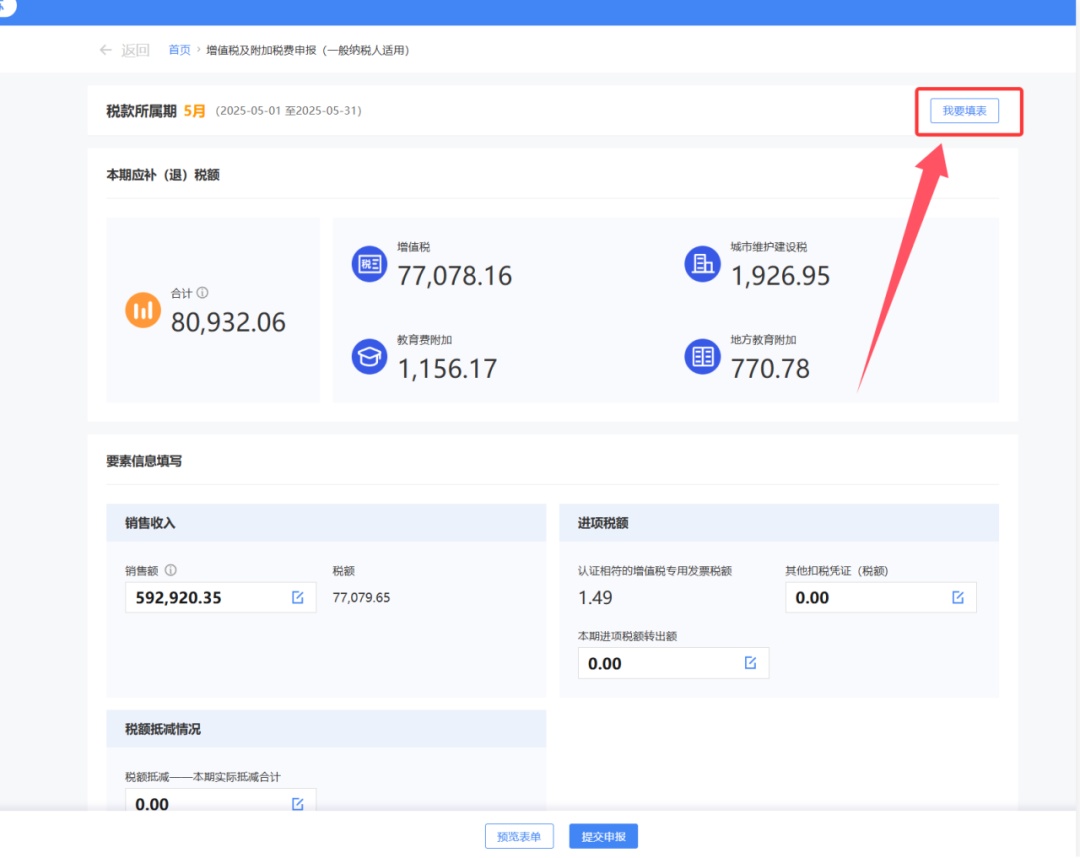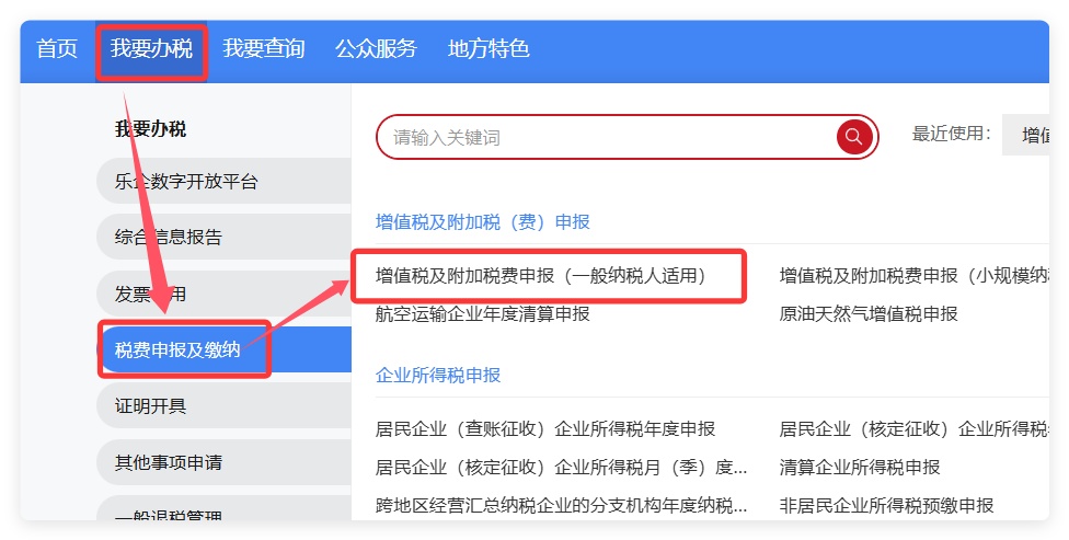 登录电子税务局,在【我要办税】-【税费申报及缴纳】-【增值税及附加税费申报(一般纳税人适用)】功能菜单中进行当期纳税申报。