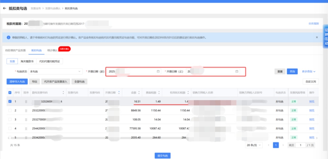 勾选状态选择 “未勾选”,输入相关查询条件,然后点击【查询】按钮,则在勾选操作区显示符合查询条件的发票。