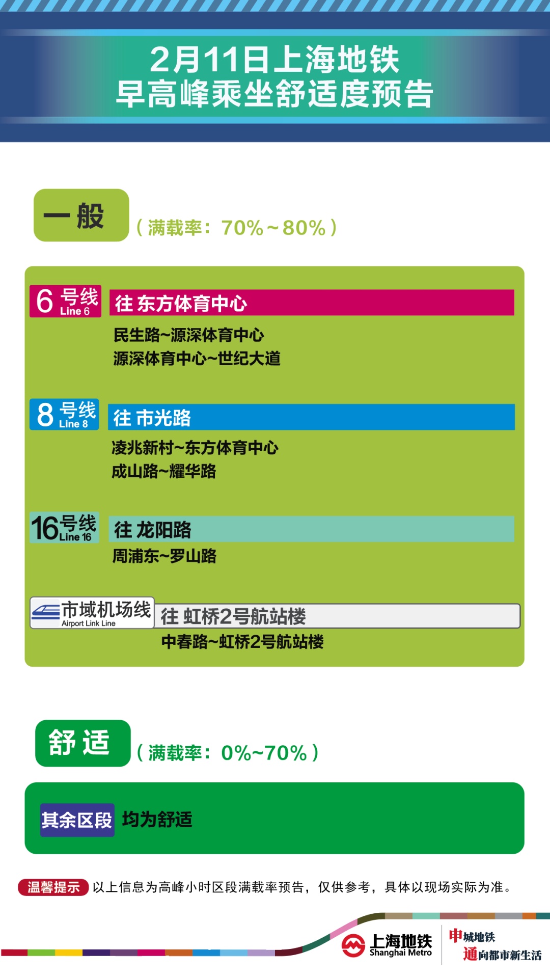 为提升上海地铁早高峰期间出行服务水平,提升乘客乘坐体验,上海地铁向乘客提供乘坐舒适度预告,方便乘客提