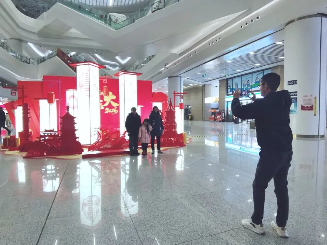 此外,站内结合新春佳节,布置了多个富有松江特色的拍照打卡点,年味十足,吸引不少旅客驻足拍照留念。