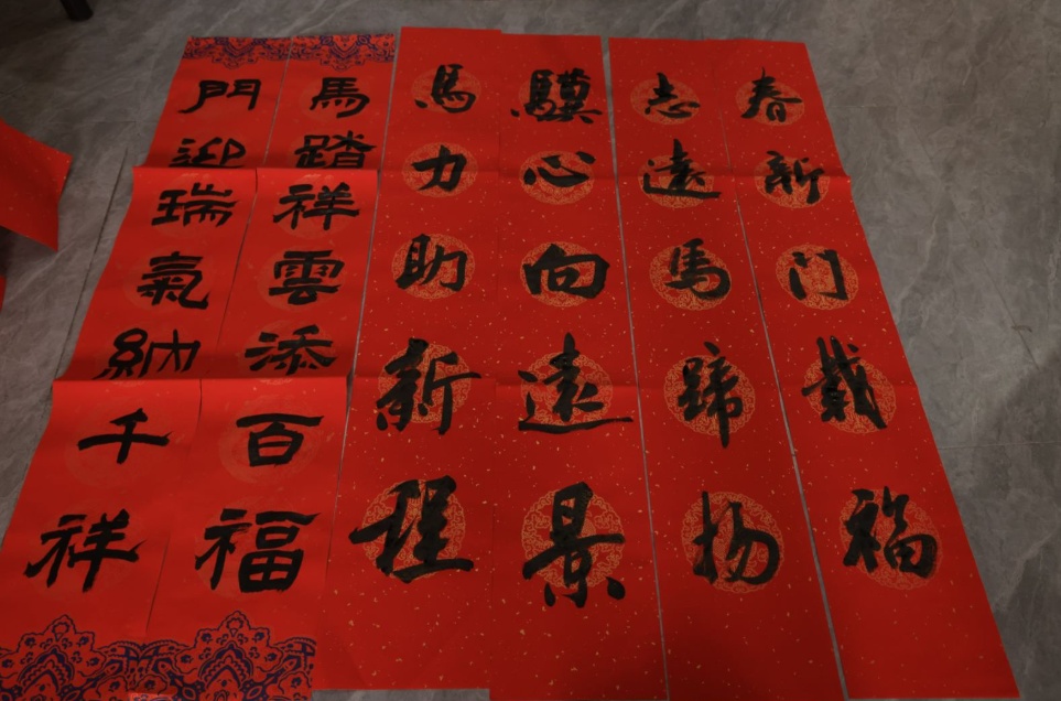 广场一侧,“新春送福”区域墨香四溢。书法家与社区爱好者挥毫泼墨,一副副春联、一个个“福”字承载着美好祝愿。“我请老师写了一副‘平安如意年年好,人顺家和事事兴’,就盼着这个!”刚拿到春联的居民吴阿姨高兴地展示着手中鲜红的对联,“这比印刷的更有温度,感觉福气更足了。”参与传统年味互动游戏、在精心布置的春节主题背景前拍照留念……大家玩得不亦乐乎。家长带着孩子一边体验,一边讲述着过年习俗,让传统文化在亲身体验和欢声笑语中悄然传承。