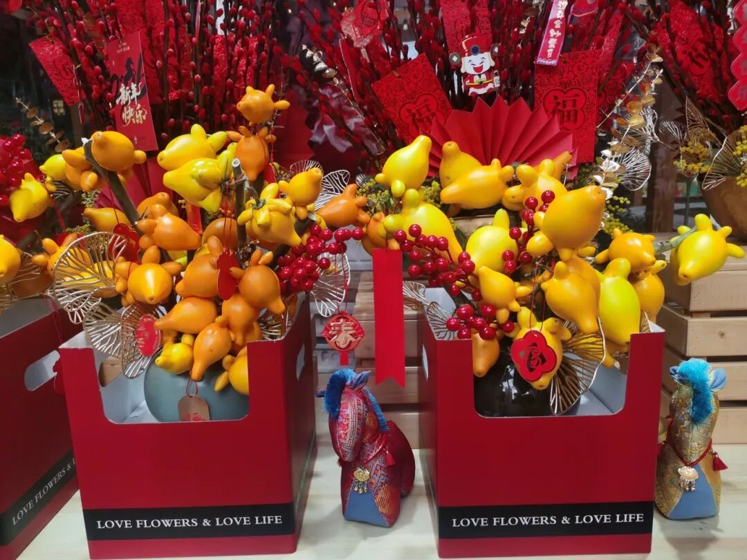 常见如银柳桶、乳茄福桶、澳洲蜡梅干花等,和蜡球朱顶红,基本不需要养护,避免潮湿,并远离空调出风口或暖器旁(防止过早褪色或变形),及时清理掉落的花瓣或花朵、果实、花粉等,修剪影响美观的枝条。如果是自行采购银柳等花材,可搭配中国结、红包等装饰,更添喜庆。