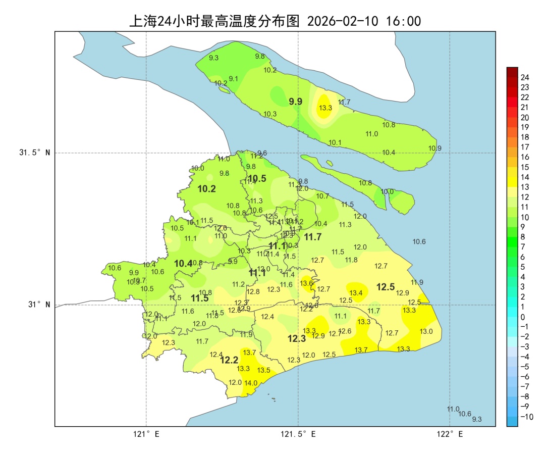 受短波槽东移影响,昨天夜间至今天凌晨本市出现小雨天气,白天多云到阴为主,风力不大,偏西风3~4级,最高气温多在10℃、11℃附近,市区徐家汇站11.1℃,体感偏湿冷。
