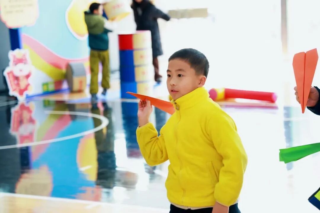 游园会现场,8大趣味游戏关卡精彩纷呈,构成了一幅生动的亲子互动画卷。在“鸿运入壶”摊位前,孩子们屏息凝神,模仿传统礼仪投箭入壶 ;另一边的“飞跃新高度”区域,小朋友们熟练地操控着无人机穿越指定洞口,科技感十足。