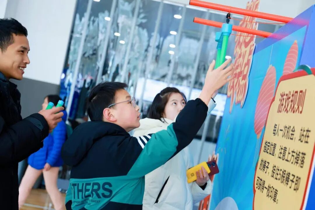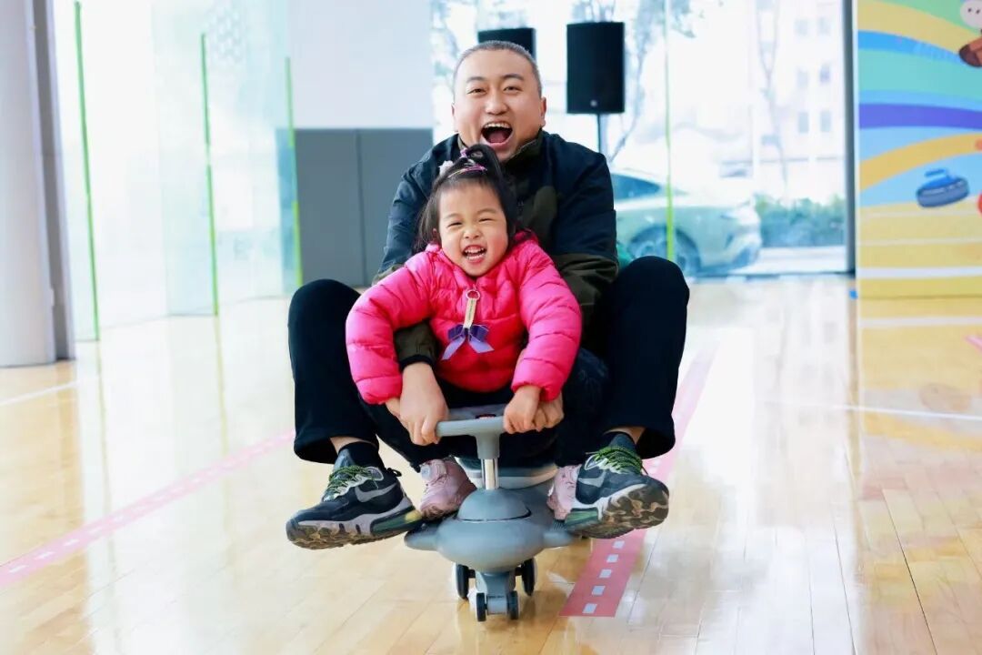 最受瞩目的莫过于“冰壶迎春对决”。随着冰壶滑出的清脆声响,两组家庭同场竞技,家长与孩子并肩作战,在策略与力量的博弈中感受竞技体育的魅力。此外,“新年飞驰扭扭车”更是上演了“速度与激情”,家长骑向终点,孩子接力返程,这种默契的配合将现场气氛推向了高潮。