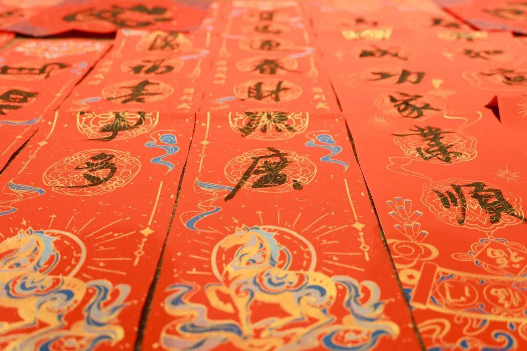 一旁,众多写好的作品已有序铺陈开来,如同红色的波浪,映衬得整个空间暖意融融。细细浏览,其中既有“新春大吉鸿运开,佳岁平安福满堂”等通用吉联,也有“马驰万里传捷报,羊跃千山送佳音”等马年特色祝福;既有大气浑厚的“福”字,也有俏皮活泼的“福马”字样,都承载着书法家们的满满心意。