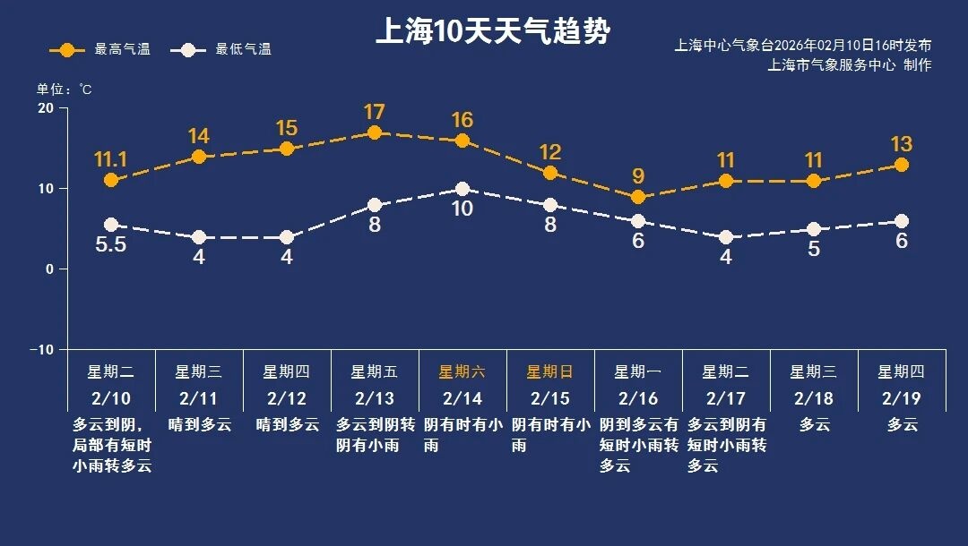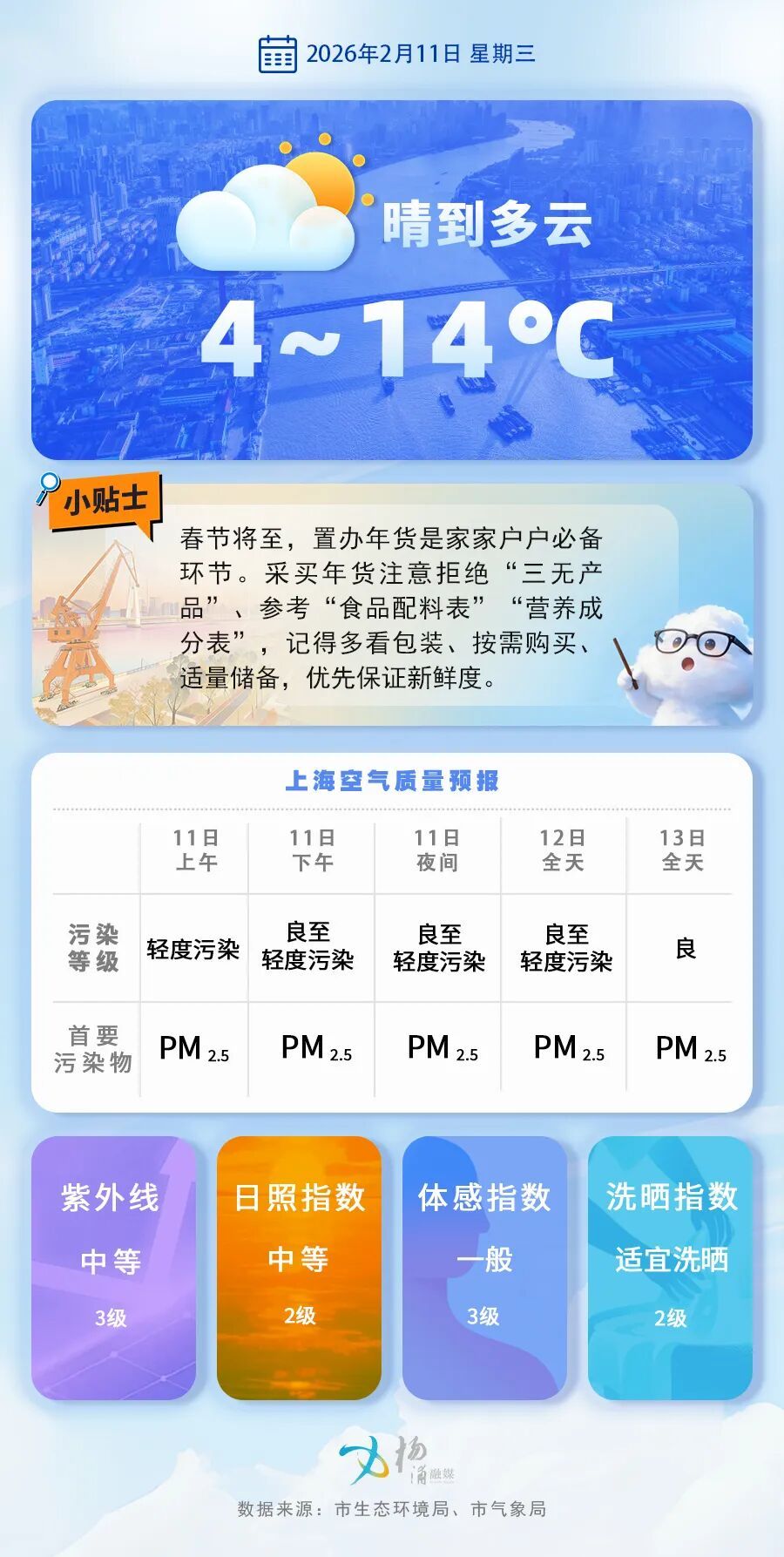 天气早知道 Feb 11 早晚有些冷,白天暖阳相伴 节前抓紧洗晒 昨天傍晚雨水来去匆匆, 今天则是暖阳相伴, 晴到多云,西北风3~4级, 相对湿度90%~40%, 气温在4~14℃, 早晚有些冷, 白天温暖体感会舒服很多, 适合洗晒和采购年货哦~ 周四持续晴好天气, 周五夜里起阴有小雨。 节前多时阴时雨的天气, 主要降水过程 出现在周五夜间至周日。 这两天抓紧洗晒! 天气趋势 周四天气晴好, 市区早晨最低气温4℃, 郊区更低一些, 最高气温可升至15℃, 早晚有点冷,白天体感偏暖。 周五起大气环流有所调整, 白天云系增多转多云到阴, 夜里起阴有小雨。 节前多时阴时雨的天气, 主要降水过程 出现在周五夜间至周日。 除夕和大年初一 天空云系较多,降水较弱。 气温先升后降, 周五的最高气温可升至17℃。 周日后期到除夕, 受冷空气影响, 风力增大,气温有所下降。 临近春节假期, 提醒大家关注临近天气, 做好生活及出行安排。