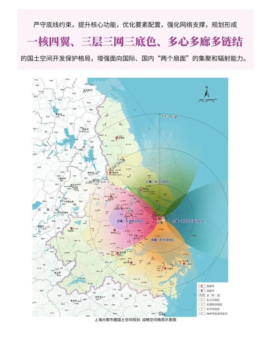 “三层三网三底色”,分别指通勤生活圈、同城功能圈、产业协作圈三个空间层次;以轨道网、航道网、公路网为重点,构建完善绿色高效多样的一体化综合交通网络及枢纽体系,形成“30—60—90分钟”出行圈;衔接省市空间底线约束,基于区域自然资源和历史人文禀赋,提升区域生态、人文、安全三大空间底色。
