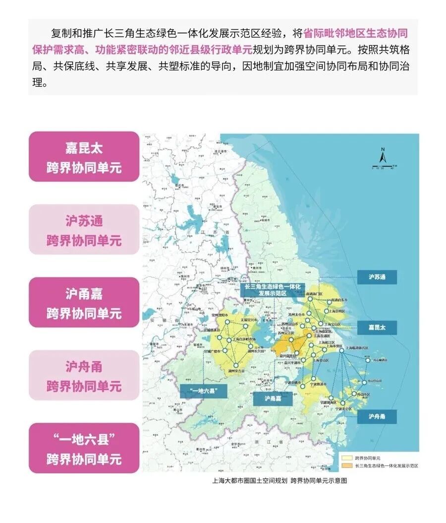 上海大都市圈国土空间规划草案中提出,复制和推广长三角生态绿色一体化发展示范区经验,将省际毗邻地区生态协同保护需求高、功能紧密联动的邻近县级行政单元规划为跨界协同单元,有嘉昆太跨界协同单元、沪苏通跨界协同单元、沪甬嘉跨界协同单元、沪舟甬跨界协同单元、“一地六县”跨界协同单元,共5个。