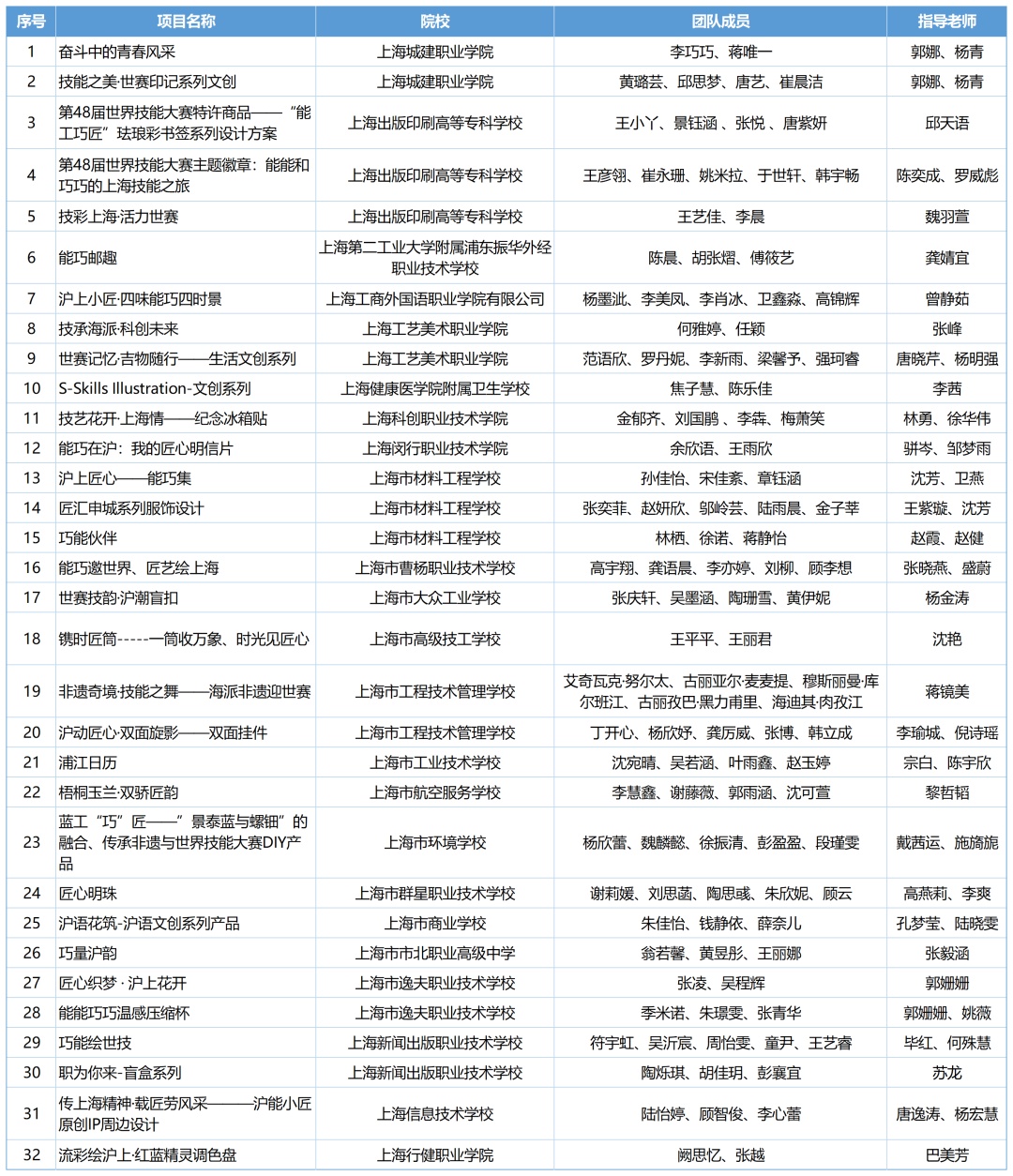 根据《上海市教育委员会关于举办第三届上海市职业院校学生创新创意大赛的通知》要求,市教委组织开展了第三届上海市职业院校学生创新创意大赛赛事工作。经校级初赛、市级复赛、决赛、网上公示等环节,最终产生金奖147个、银奖350个、铜奖300个、优胜奖若干个及优秀组织奖,一起来看名单——