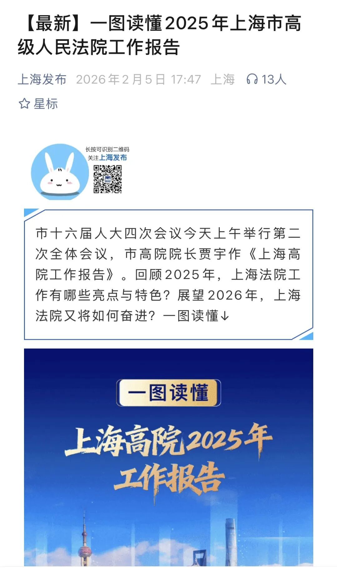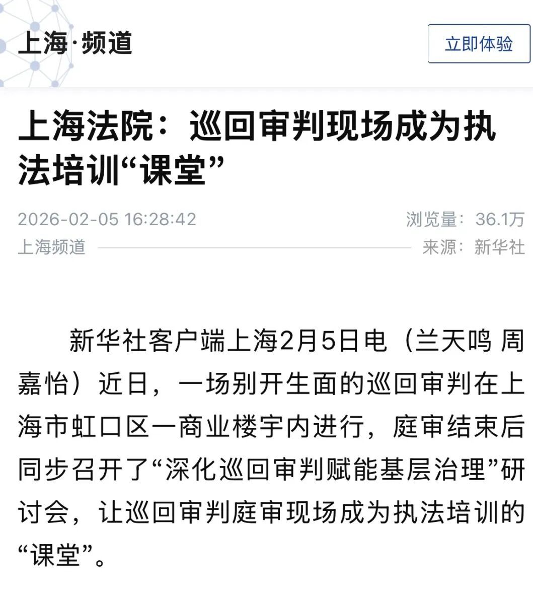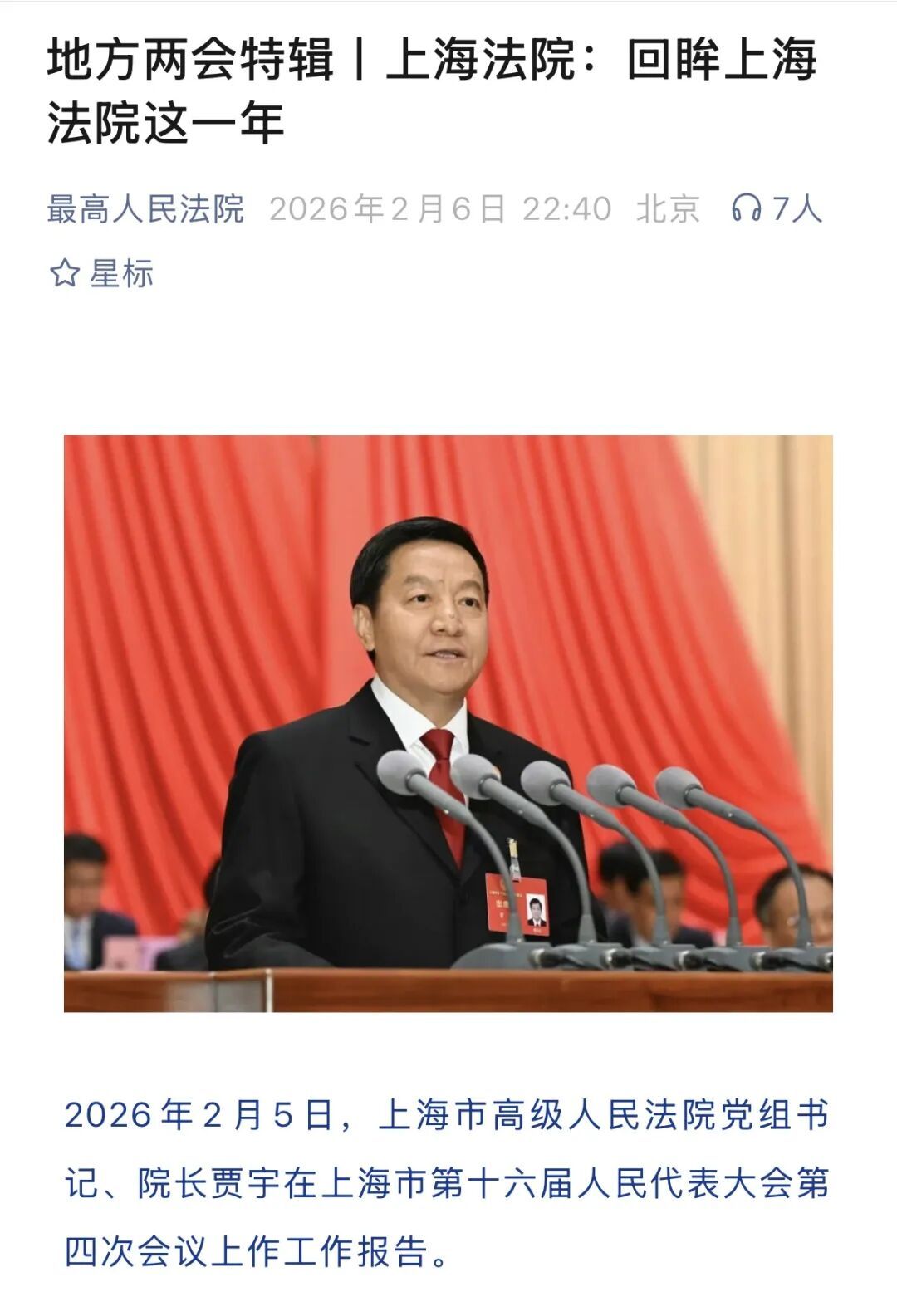 近日,上海市第十六届人民代表大会第四次会议圆满落幕。2月5日上午,上海市高级人民法院党组书记、院长贾宇作上海市高级人民法院工作报告( 点击查看详情),系统回顾了2025年上海法院的整体工作与特色亮点,并积极展望2026年上海法院的奋进之路。本次上海两会宣传引发社会广泛关注和媒体多维度报道,现将部分报道予以摘编。