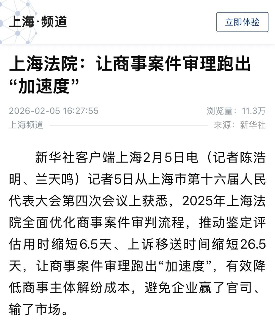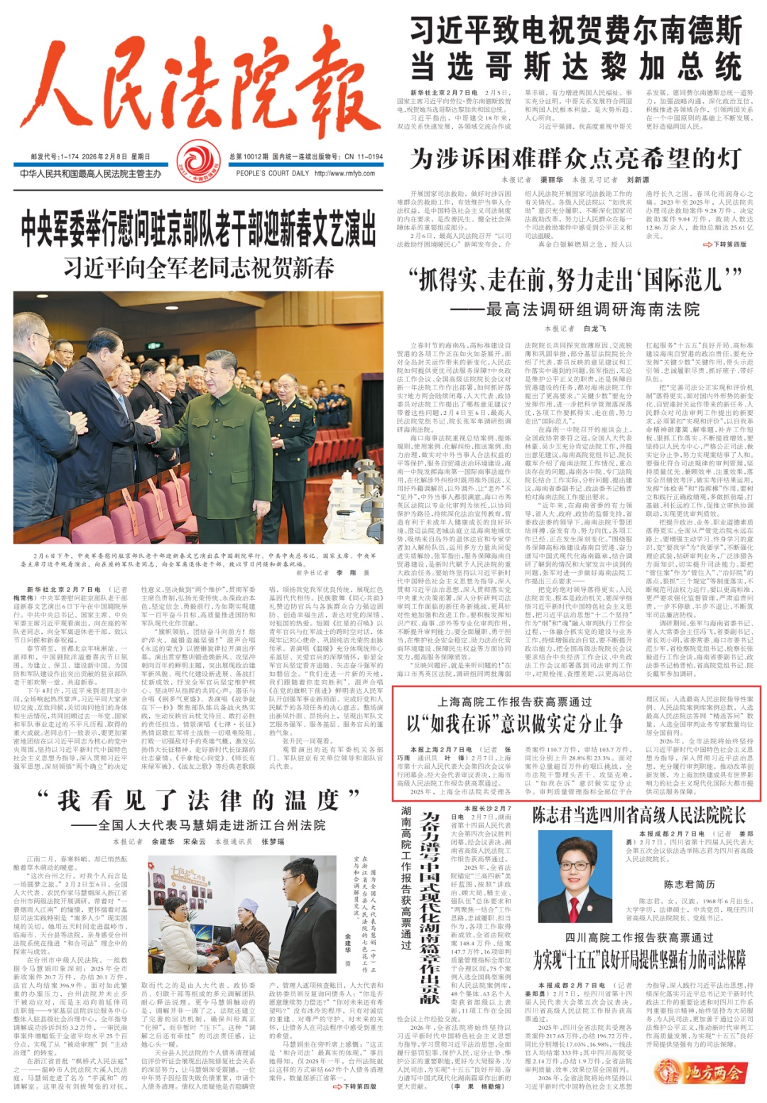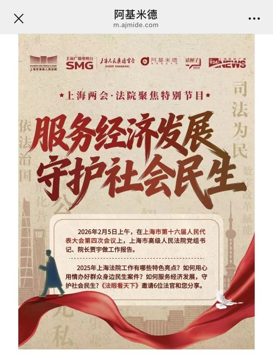 近日,上海市第十六届人民代表大会第四次会议圆满落幕。2月5日上午,上海市高级人民法院党组书记、院长贾宇作上海市高级人民法院工作报告( 点击查看详情),系统回顾了2025年上海法院的整体工作与特色亮点,并积极展望2026年上海法院的奋进之路。本次上海两会宣传引发社会广泛关注和媒体多维度报道,现将部分报道予以摘编。