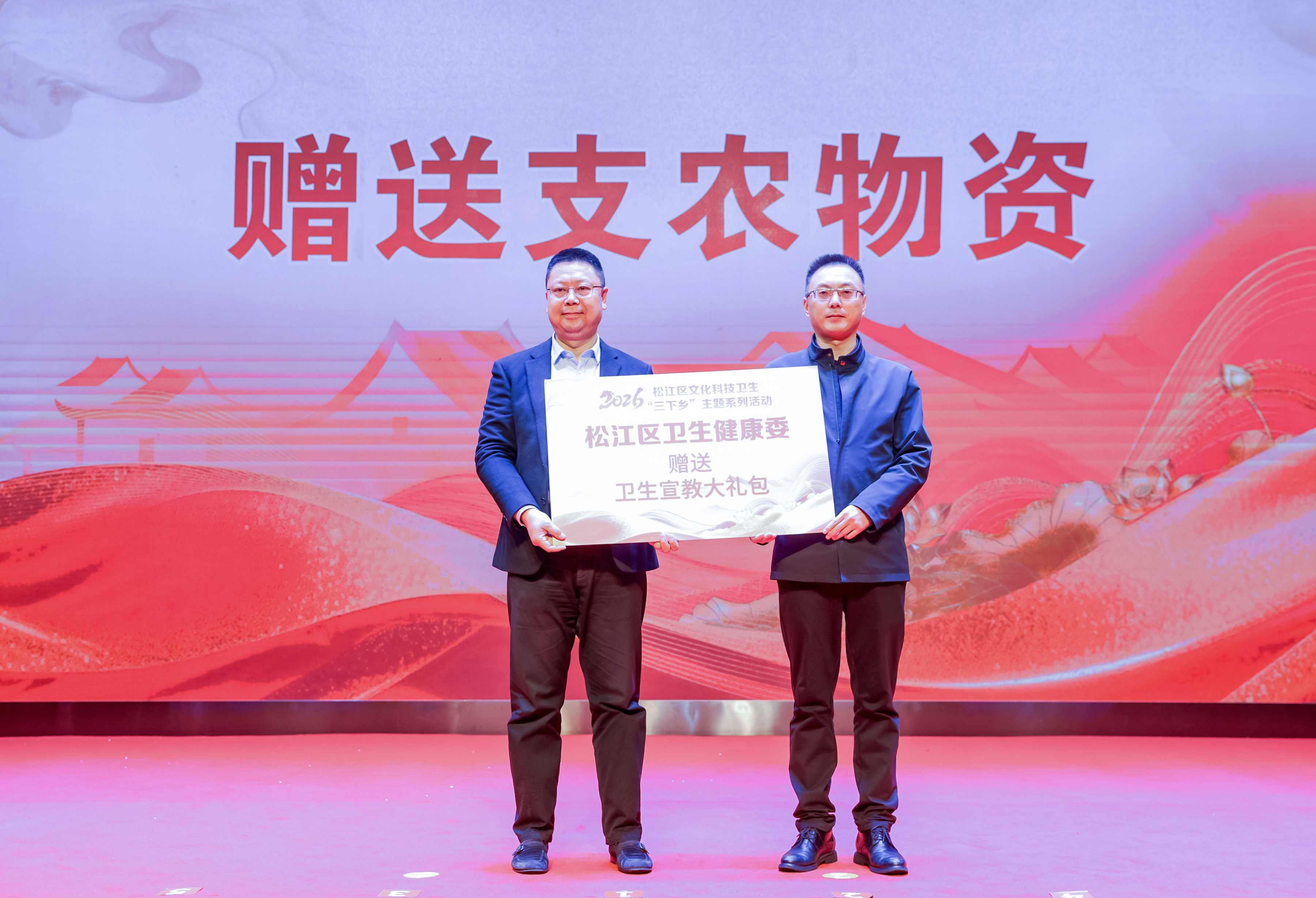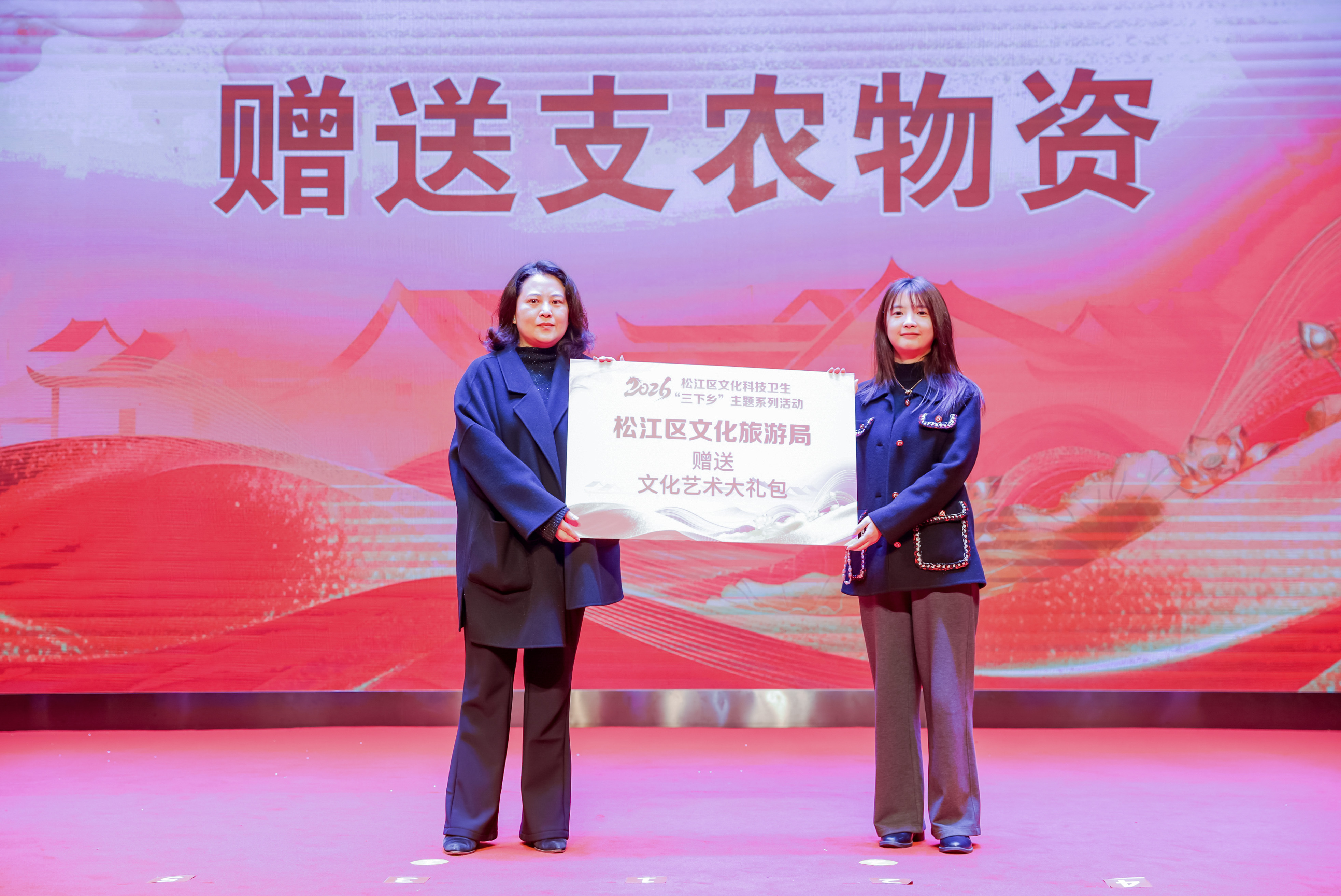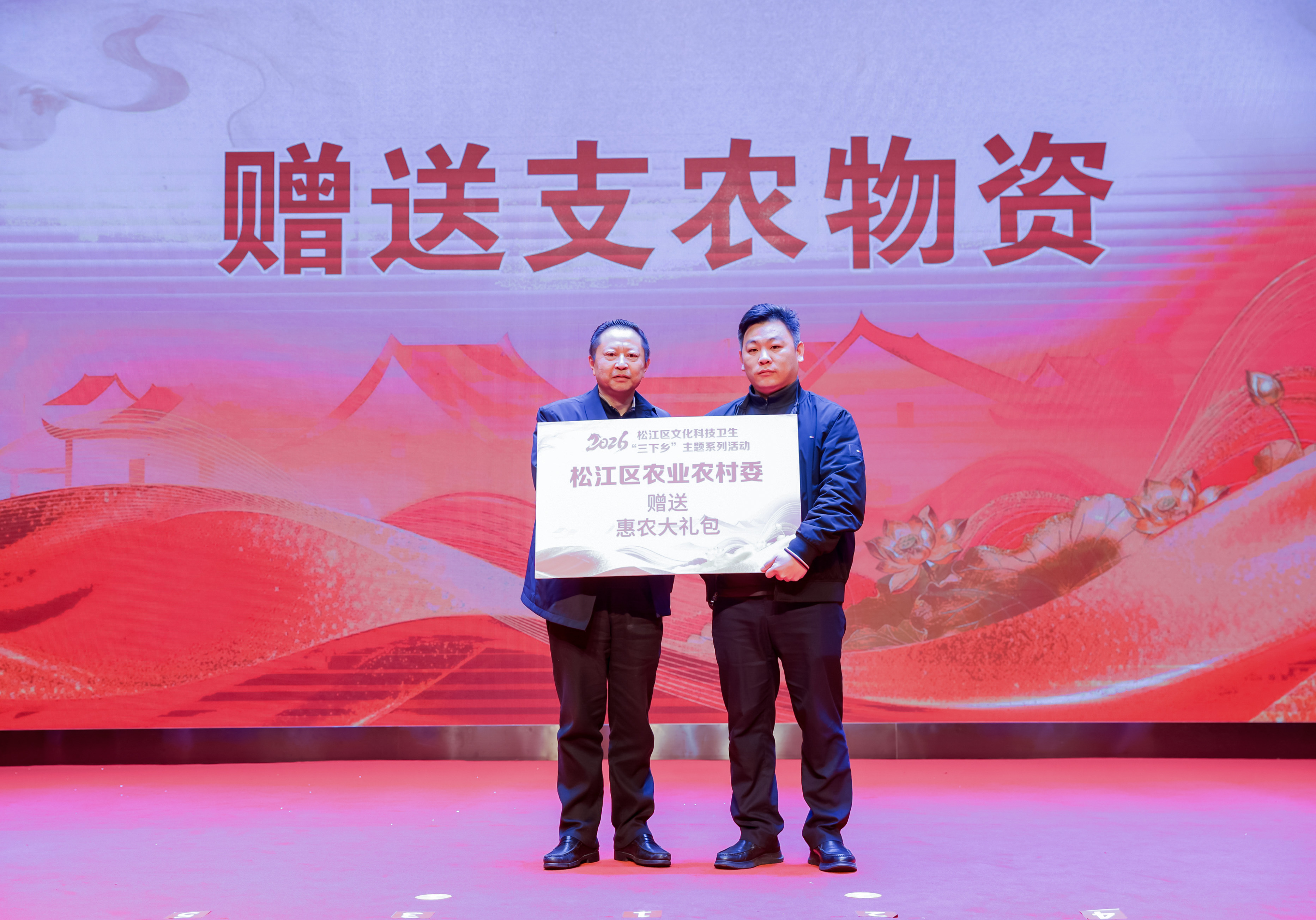 活动现场,2026年松江区“三下乡”35个常项目发布。区文旅局、科委、农委、卫健委、司法局等单位为新浜镇送上文化、科技、惠农、卫生宣教、法治宣传等系列大礼包。