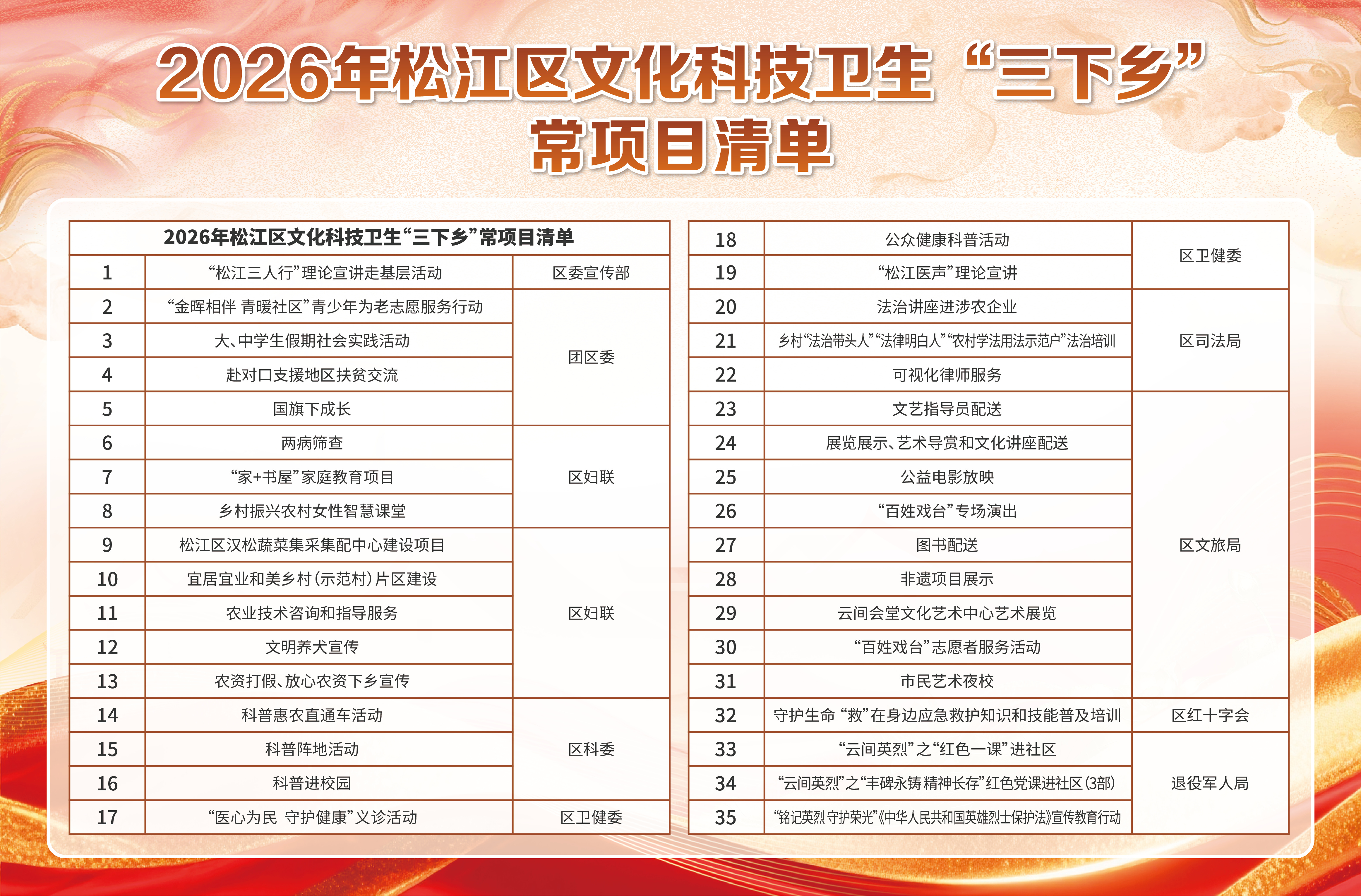 2026年松江区文化科技卫生“三下乡”常项目清单
