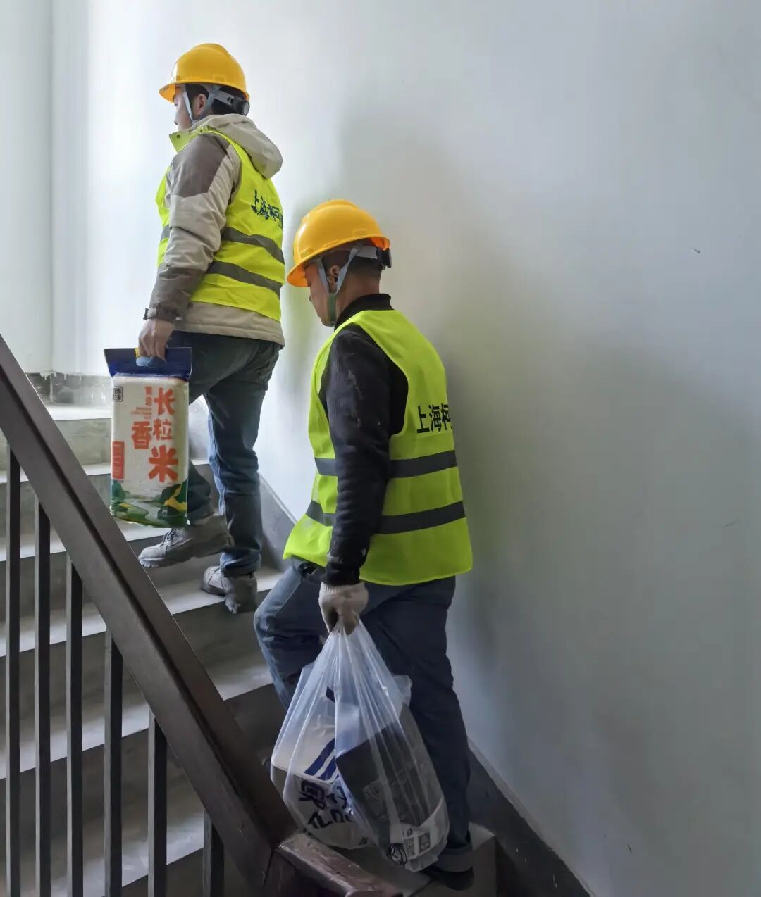 电梯施工停运期间,施工方为高层独居老人拎重物