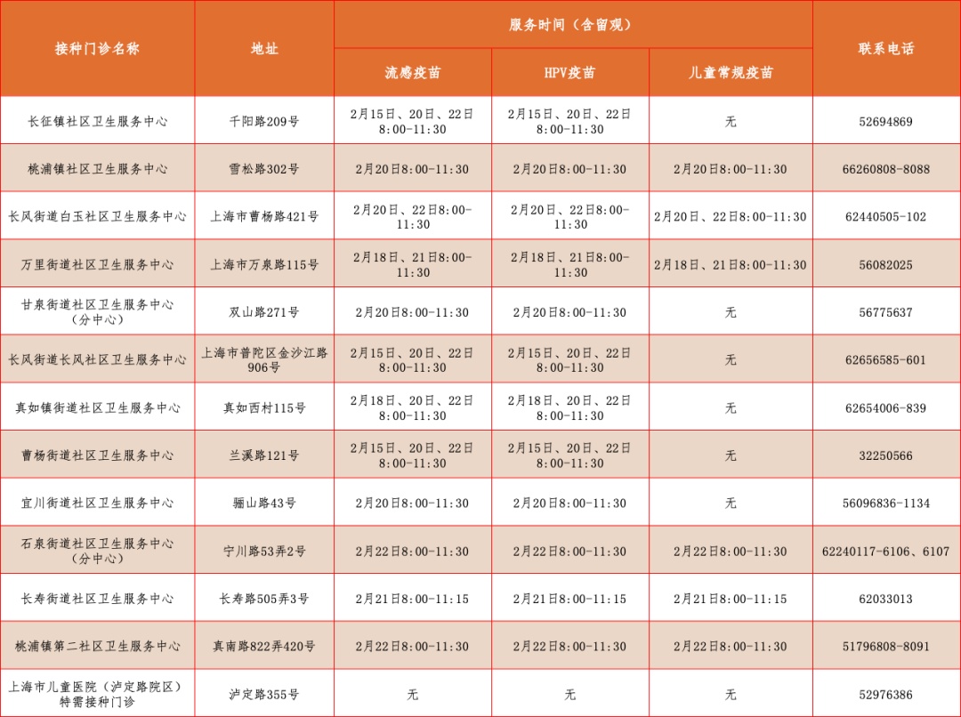 2026年春节假期(2月15日-2月23日),为方便广大居民接种疫苗,普陀区进一步优化预防接种服务,现将各预防接种门诊开诊信息公布如下: