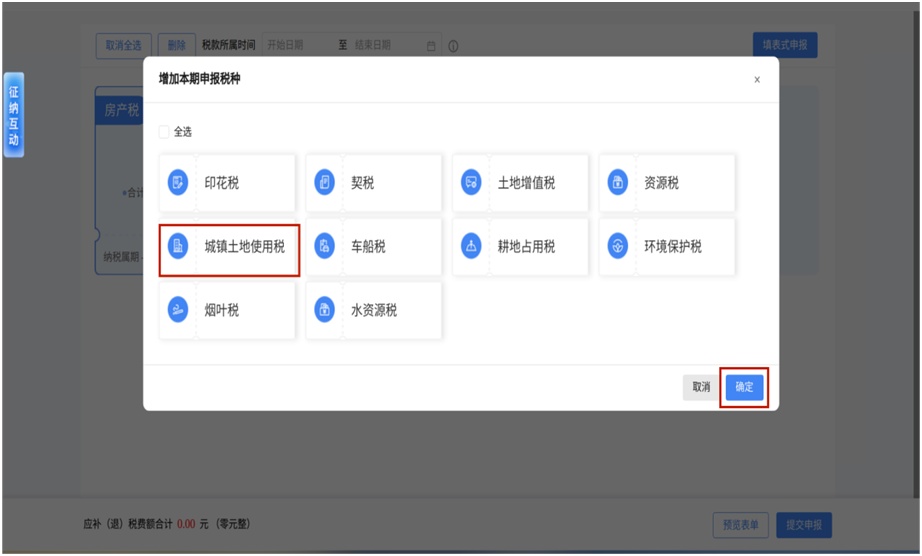 2. 勾选增加税种:“城镇土地使用税”或“房产税”,点击“确定”。
