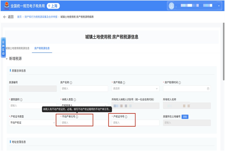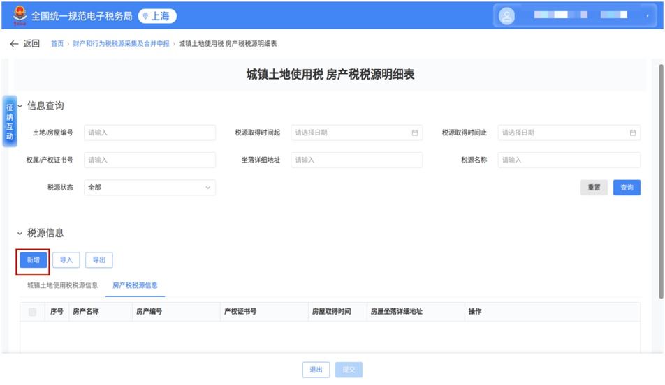 4. 以房产税税源信息为例,点击“新增”,弹出“城镇土地使用税 房产税税源信息”界面。