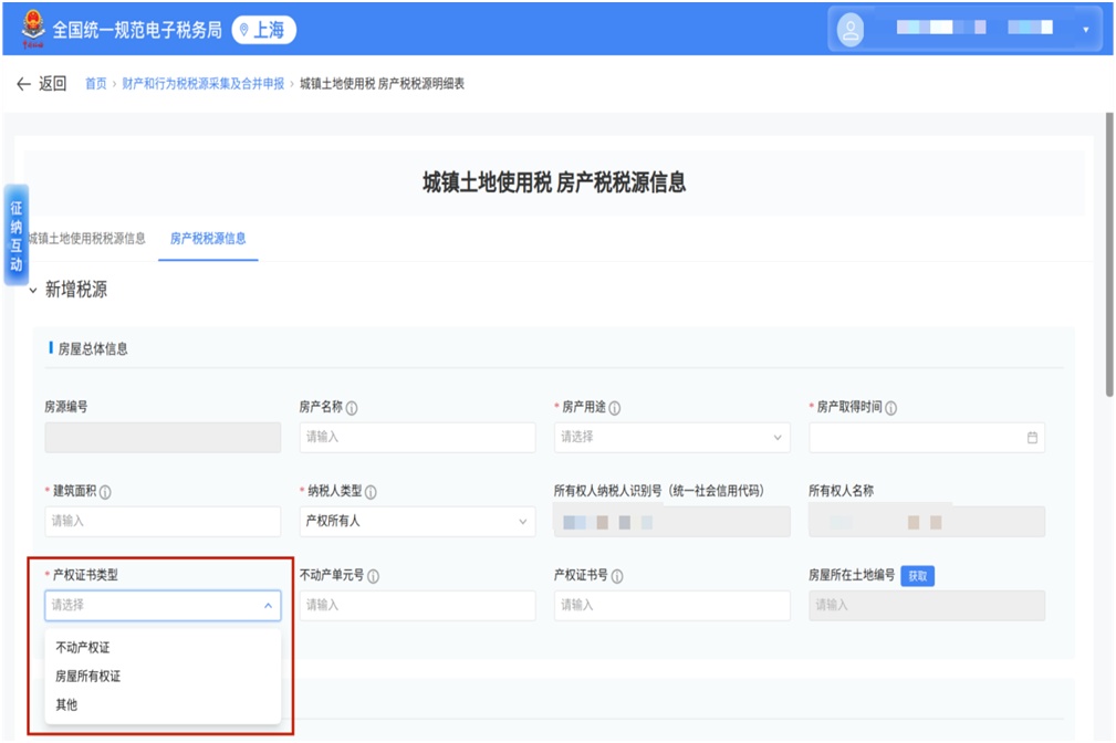 5. 在“城镇土地使用税 房产税税源信息”界面,选择“产权证书类型”,可选择“不动产权证”、“房屋所有权证”和“其他”。