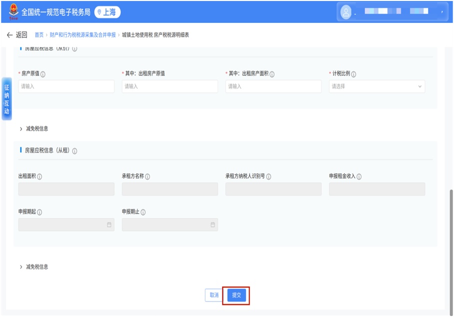 3. 点击卡片上的“税源采集”,跳转到“城镇土地使用税 房产税税源明细表”界面,自动带出已有土地信息、房屋信息。