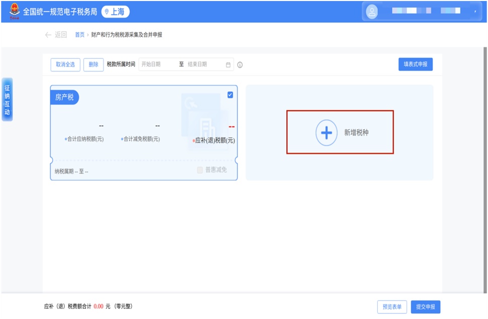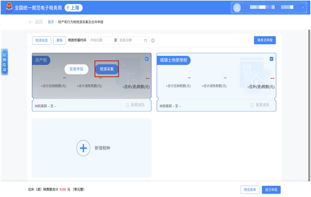 1. 进入【财产和行为税税源采集及合并申报】模块,点击【新增税种】。