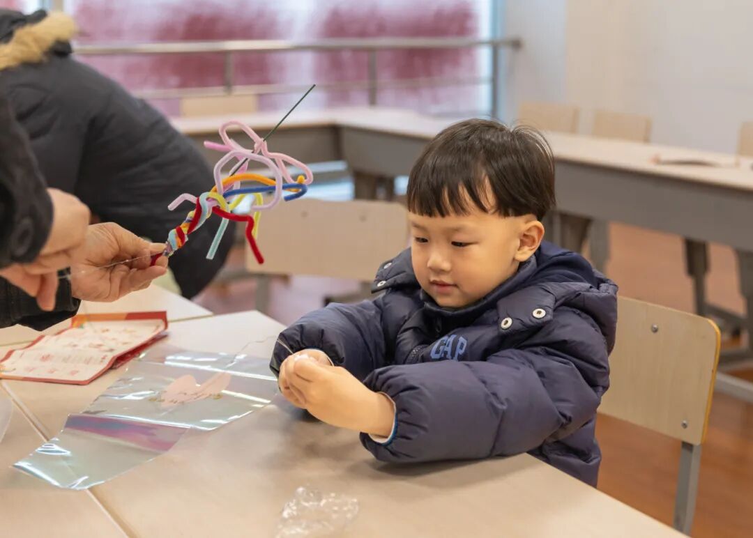 “马上出品”体验区聚焦手工互动,设置扭扭棒烟花、织锦风铃、巧拼新春挂盘三项DIY活动。家长与孩子协同合作,完成各类手工作品,在亲子互动中丰富新春体验,传递节日喜悦。