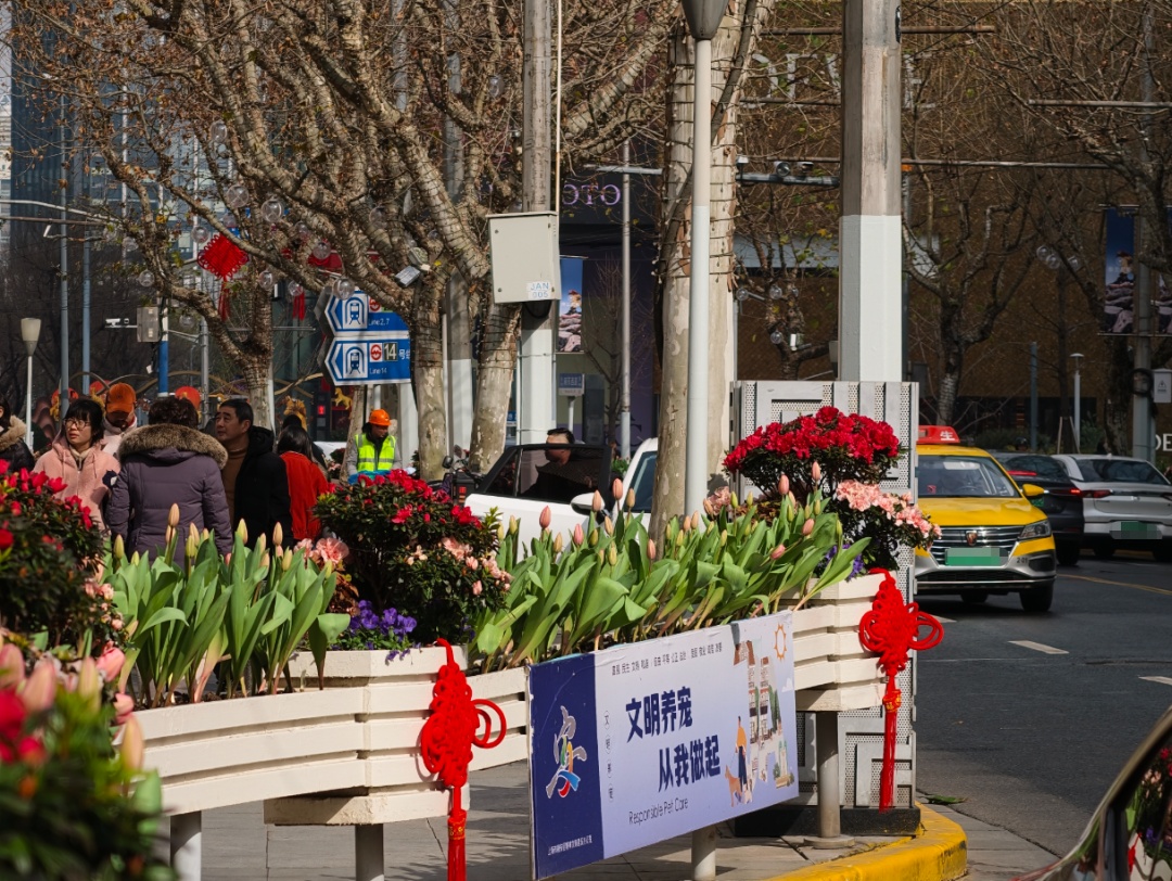 南京西路沿线的花箱更是给市民带来新春的惊喜——郁金香悄然上新,绽放出早春的色彩,与装饰在花箱上的中国结相映成趣,为繁忙的都市街景带来一抹灵动生机。