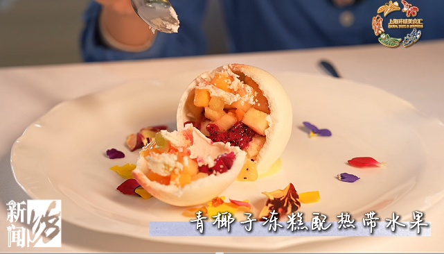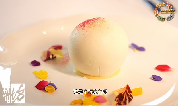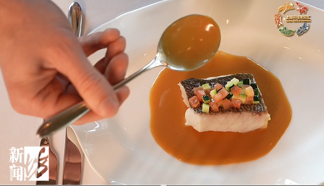这道主菜是其实是主厨的创新菜,由中国的黄鱼配上法餐的灵魂酱汁,酱汁里混合了胡萝卜、韭菜、洋葱、黄油还有中国黄酒,“所以这道法餐里有来自中国的大黄鱼和黄酒,就很中国。”