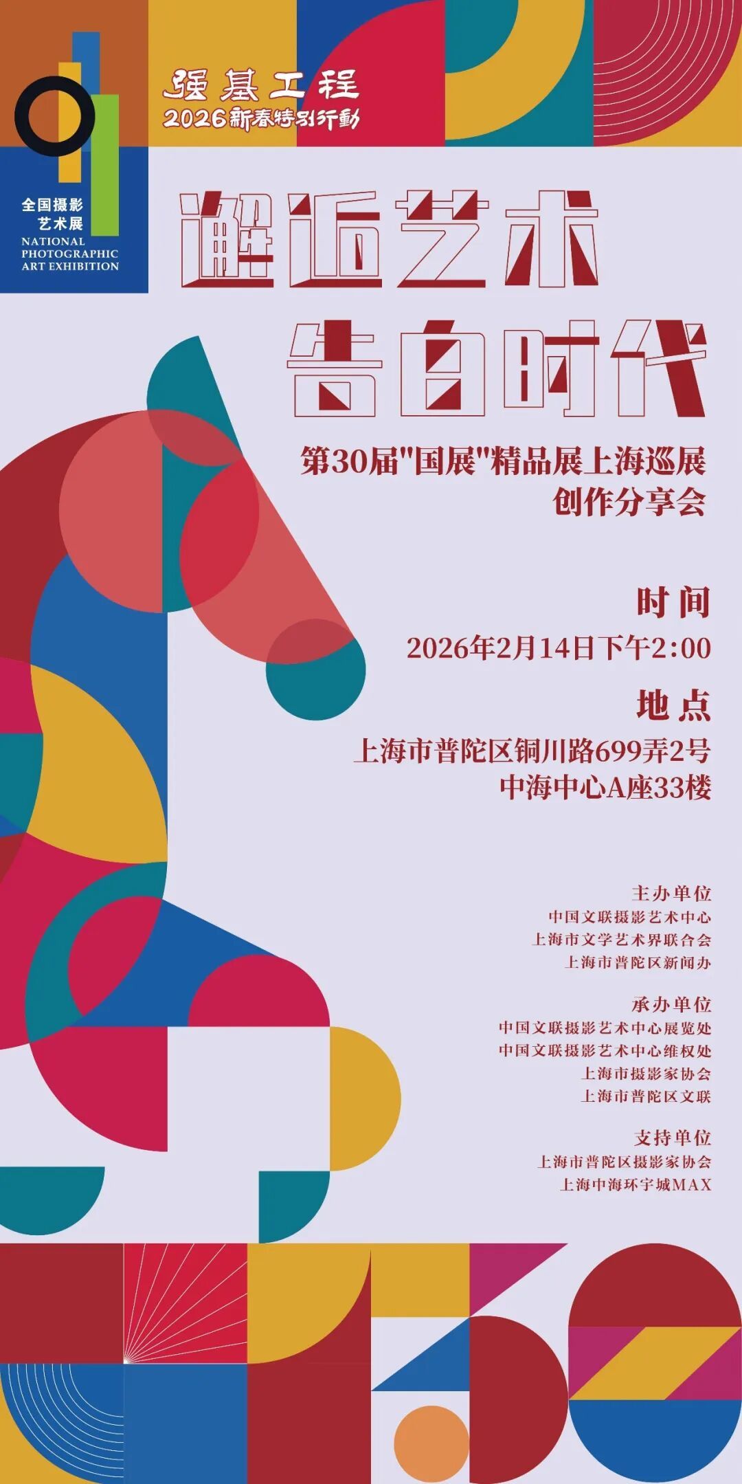 2月12日,“第30届全国摄影艺术展览”精品巡展空降申城,这也是全国范围内的30届“国展“精品巡展的首秀,申城迎春的喜气由此更多了一份艺术气息。 2月14日,主办方还特别策划了名为“邂逅艺术,告白时代”的摄影创作分享会,多位入选30届“国展”的上海摄影人将亲临现场,讲述创作的心得体会和心路历程,分享创作的经验和对摄影艺术的种种感悟。诚邀您一起聆听,参与互动。 时间:2026年2月14日 14:00-16:00 地点:上海市普陀区铜川路699弄2号 中海中心A座33楼 名额有限,参与活动报名 请扫描下方二维码