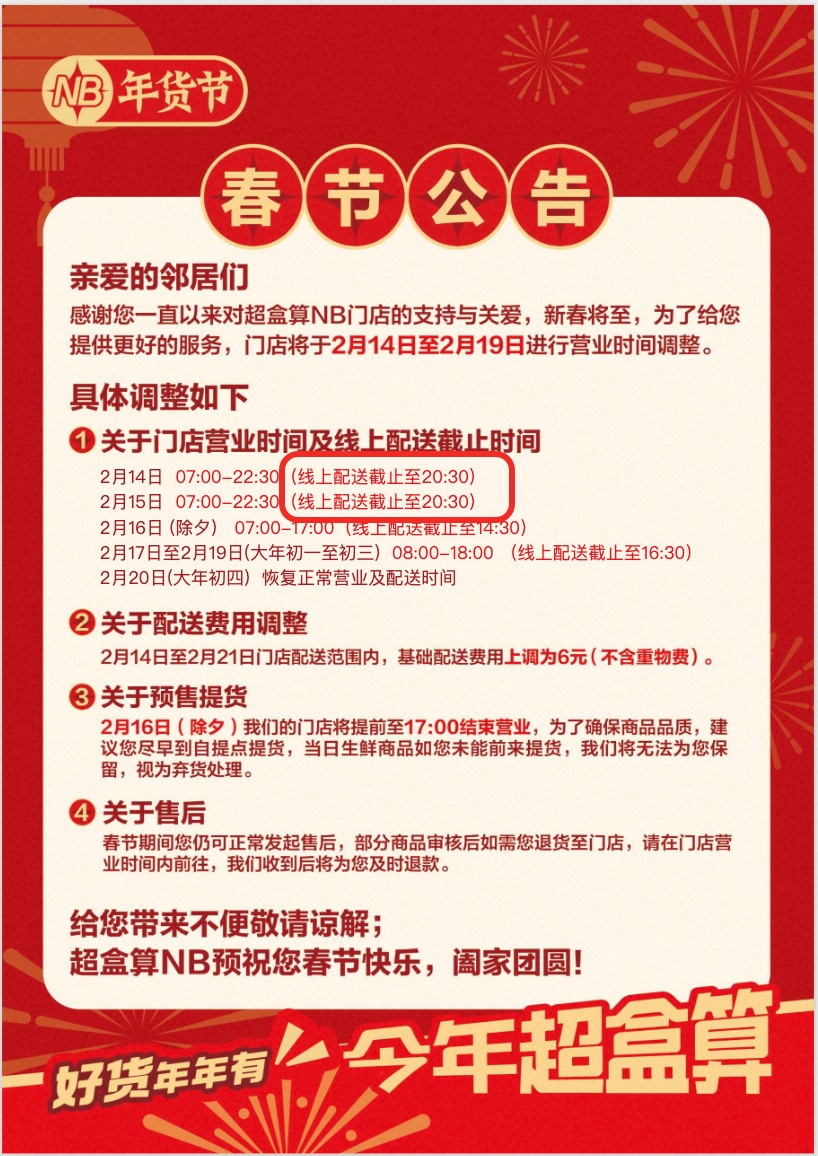 此外,超盒算全国NB门店在整个春节期间照常营业,仅除夕夜到初三会提前到傍晚下班,方便员工与家人团聚。