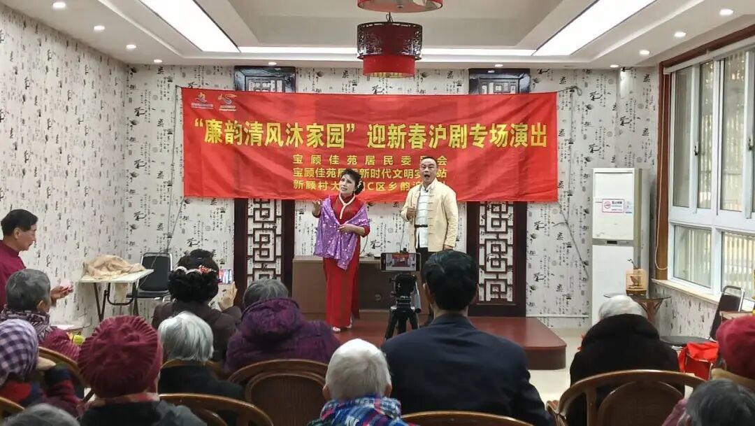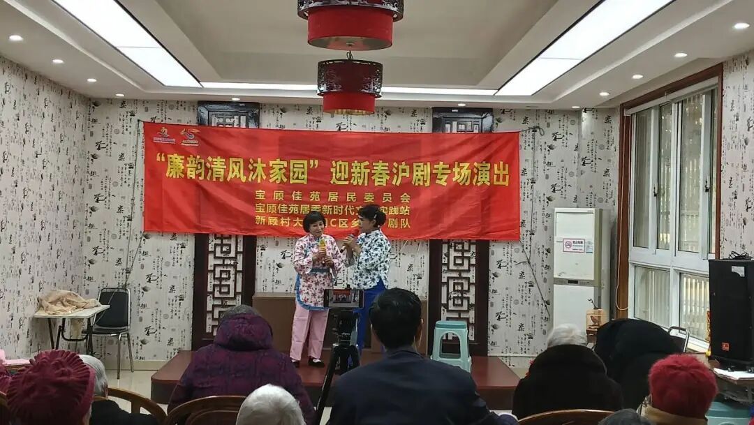 宝顾佳苑居民区党支部在“四百”大走访中发现,小区中有不少老年人爱好沪剧表演,为了丰富居民群众的精神文化生活,牵头组建了乡韵沪剧队。同时,充分发挥“宝顾邻里站”社区共享空间作用,为社区各类文体团队提供训练场地。时值年末,党支部将主题党日与社区服务深度融合,举办“廉韵清风沐家园”迎新春沪剧专场活动。五十余位居民共聚一堂,品味乡音雅韵、感受党的关怀。两个多小时的演出,登台表演的沪剧爱好者声情并茂地演绎《庵堂相会》《姑嫂对唱》等经典选段,台下的观众轻声应和,积极互动。这场温馨的演出,正是“服务群众无小事,桩桩件件连民心”的生动体现。