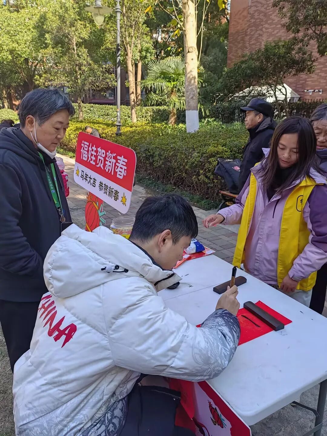 在依云湾小区的中心广场大草坪上,一场以“马年迎春剪窗花、挥毫泼墨写春联”为主题的亲子文化活动将传统年味与童真巧思编织成冬日最温暖的风景。民间艺人李老师以“马到成功”“龙马精神”为切入点,讲述剪窗花、写春联的民俗渊源,从折纸对称之美到笔锋顿挫之韵,每一个细节都浸润着文化基因。孩子们手持剪刀,在红纸上剪出奔腾小马、团圆福字,指尖翻飞间,传统纹样与童趣创意相融;挥毫蘸墨,在春联上书写“春风得意马蹄疾”的祝福,稚嫩笔触里藏着对年节的热切期盼。这场“指尖上的年味”活动让传统年俗在社区生根,让文化自信在童心中萌芽。
