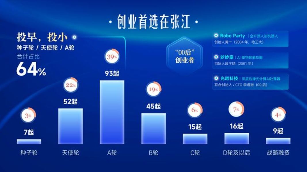 现场专家表示,张江融资不仅在规模上领跑,在融资阶段覆盖、融资企业质量及资本生态完善等方面展现出显著优势。特别是A轮融资以93起、39%的占比成为全年最活跃阶段,显示出张江大量硬科技企业已跨越最初的技术验证期,正进入由“能不能做”向“做不做得大、做不做得稳”转变的关键阶段。这一结构表明,张江正在集中孕育一批具备放大潜力的成长期企业。