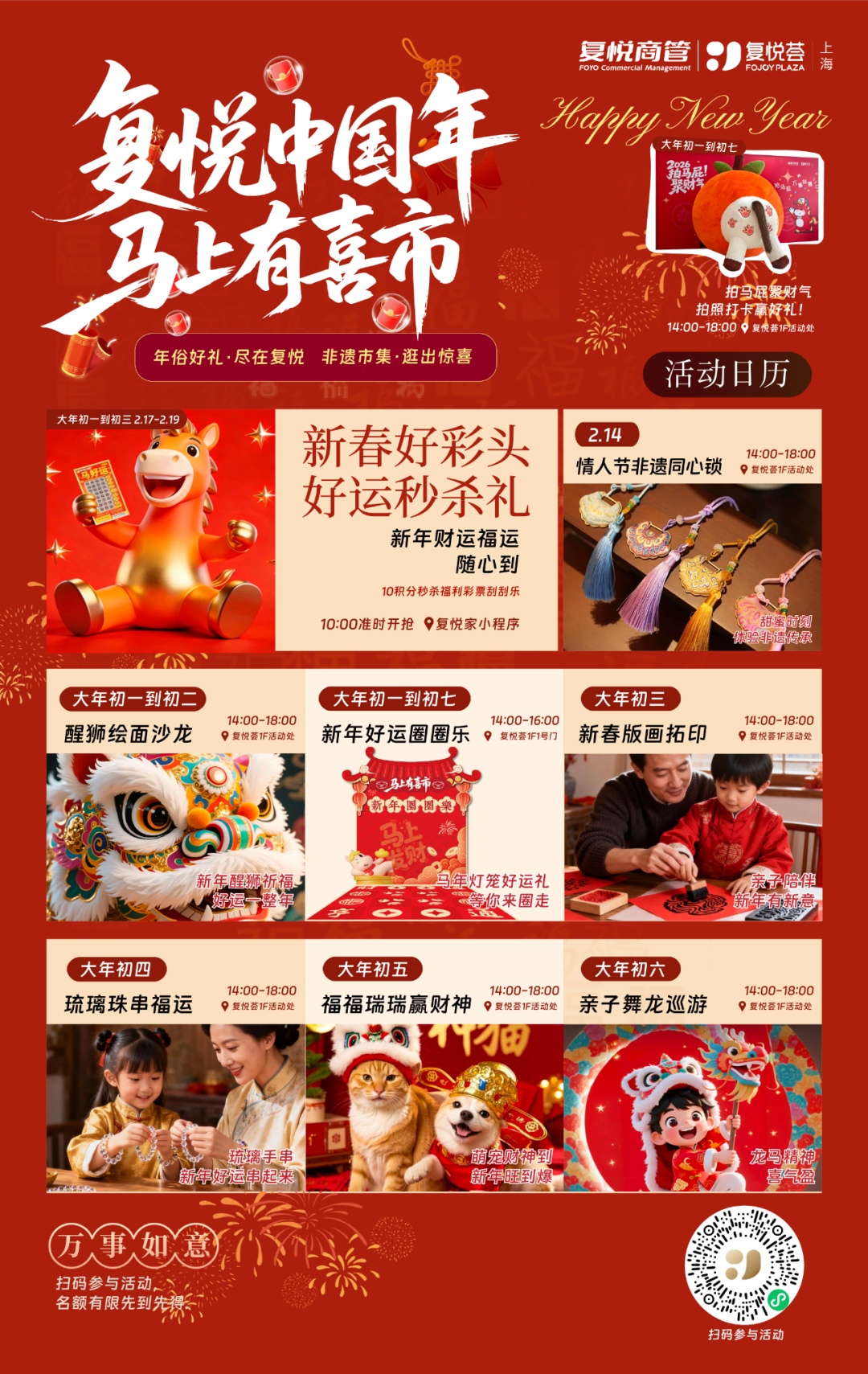 复悦荟以“复悦中国年,马上有喜市”为主题,从正月初一到初七,为市民打造了一场集年俗、非遗、互动于一体的新春嘉年华。
