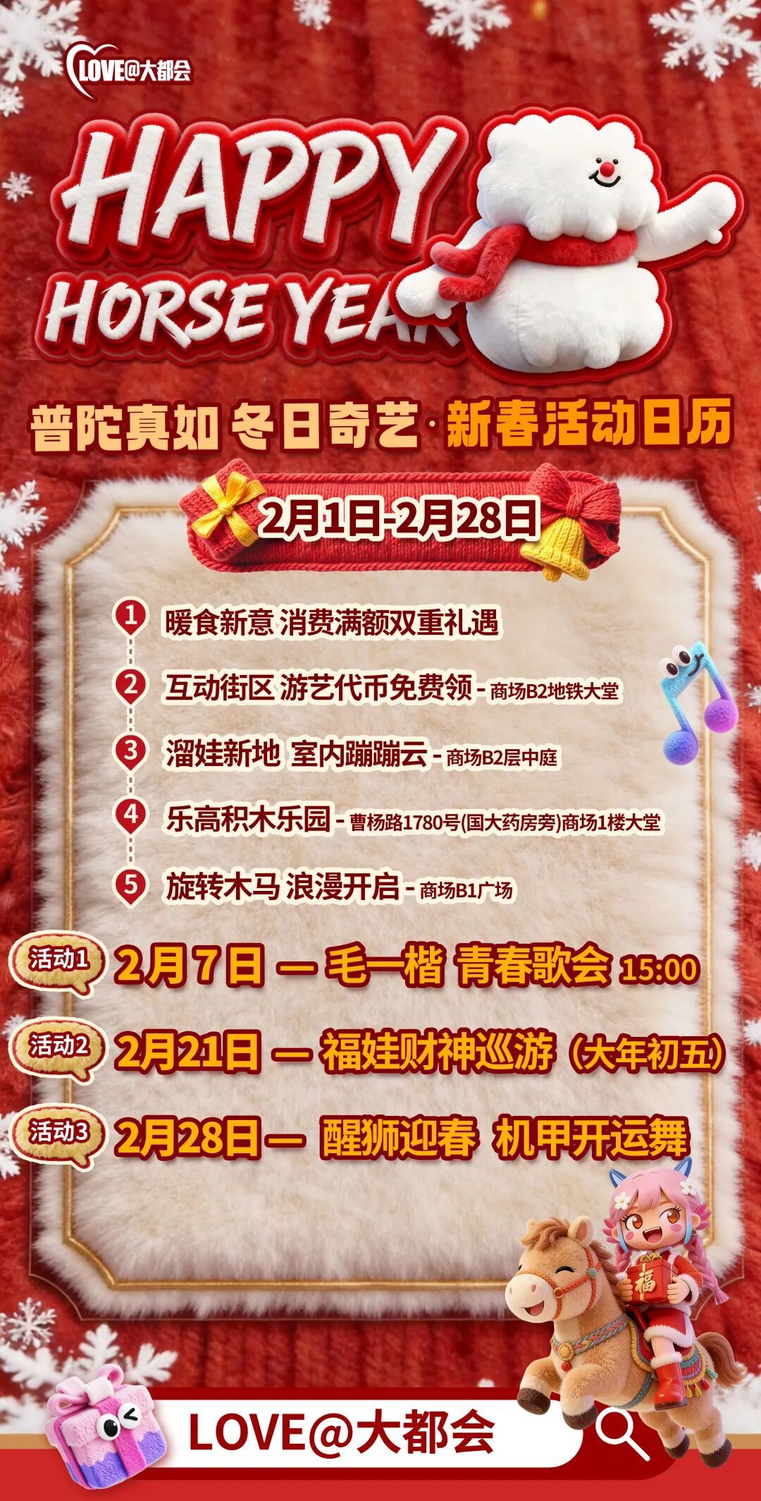 LOVE大都会则以“冬日奇艺・新春活动日历”从暖食消费到亲子游乐,再到特色巡游,为市民提供了一站式的新春欢乐体验。即日起至2月28日,推出“暖食新意”消费满额双重礼遇,餐饮消费叠加优惠,让市民吃得尽兴。