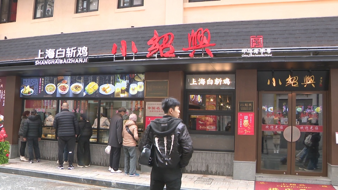 中午,记者在山西南路南京路步行街现场看到,“老字号美食街区”招牌以及各大美食餐饮品牌的标示格外醒目,大壶春、洪长兴、小绍兴、德大、德兴馆、五芳斋和小金陵等众多老字号品牌门店一字排开,格外醒目,每家门店都是顾客盈门,一座难求。在小绍兴,外卖窗口排起了长队,乳腐肉、油爆虾、沙拉等本邦菜成为不少市民的最爱。“这里是老上海的老味道了。小绍兴从云南路搬过来,今天第一天开我正好赶上了。这些店我刚才都吃了,味道不错。”