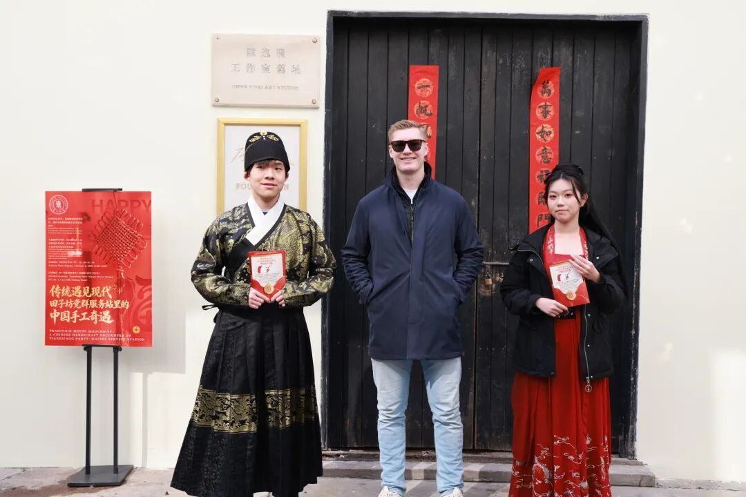 活动未开始,文化探寻已启动。田子坊入口与岔路口的古风箭头指示牌,成为不少游客第一张打卡照的背景。“跟着中国结的箭头走,像在寻宝一样!”一位英国游客笑称。而身穿汉服、中英双语流利的志愿者,在热闹的田子坊街区主动向中外游客发出邀请,递出那张印有服务站地址的雅致“邀约卡”,成功将人流引向这处 “巷弄里的文化客厅”。