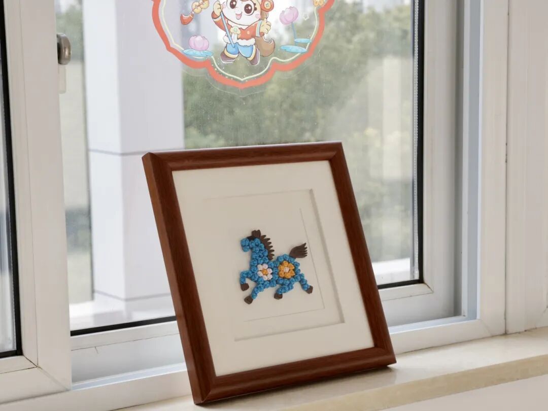 现场,构月霞带来了马年新作——一幅用五十六枚盘纽制成的骏马装饰画,其造型灵感来源于马年纪念币。“五十六枚盘纽,象征我们五十六个民族。”构月霞介绍,“它们紧密相连,就像各民族同胞一样,各有特色,却始终同心同行。”