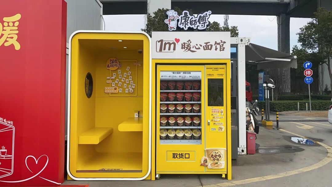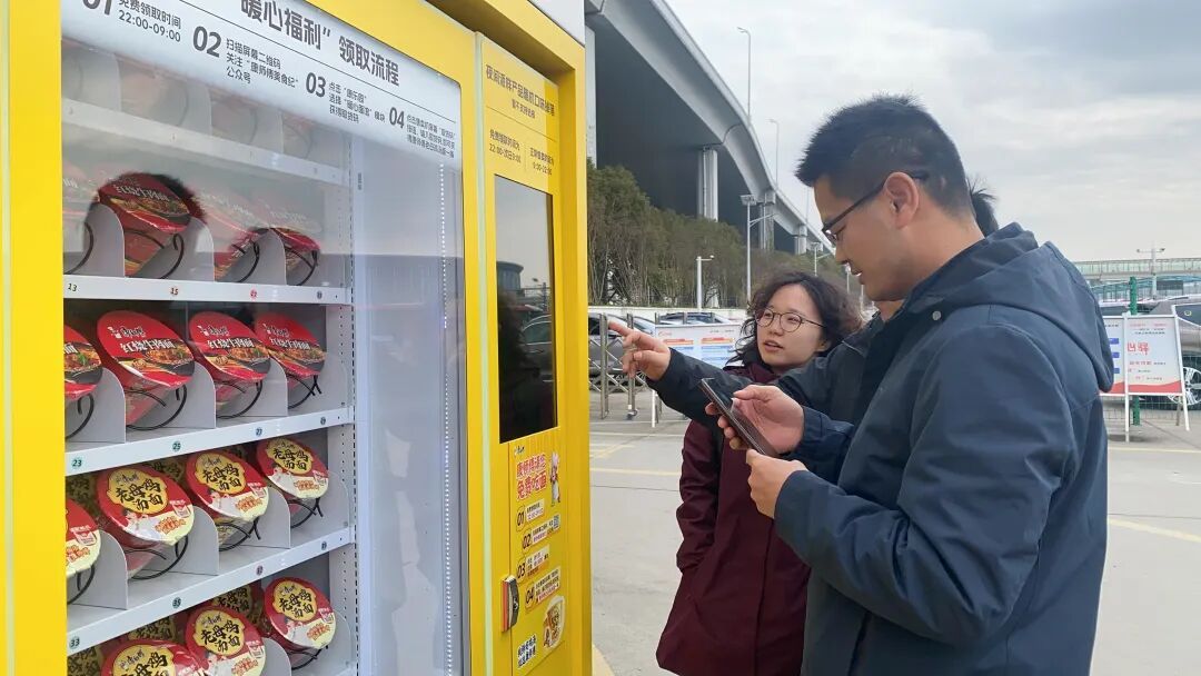 当天14时,活动正式开始。室外广场上,康师傅“1㎡”暖心面馆揭牌,这也是闵行区第二家此类暖心面馆。黄色的面馆温馨明快,形似车厢,备有餐巾纸、饮水机,晚上10点至次日早上9点司机可免费领取一碗老母鸡汤面或红烧牛肉面,其余时间仅需5元,后台会根据数据实时补货,为深夜奔波的司机们驱散疲惫。