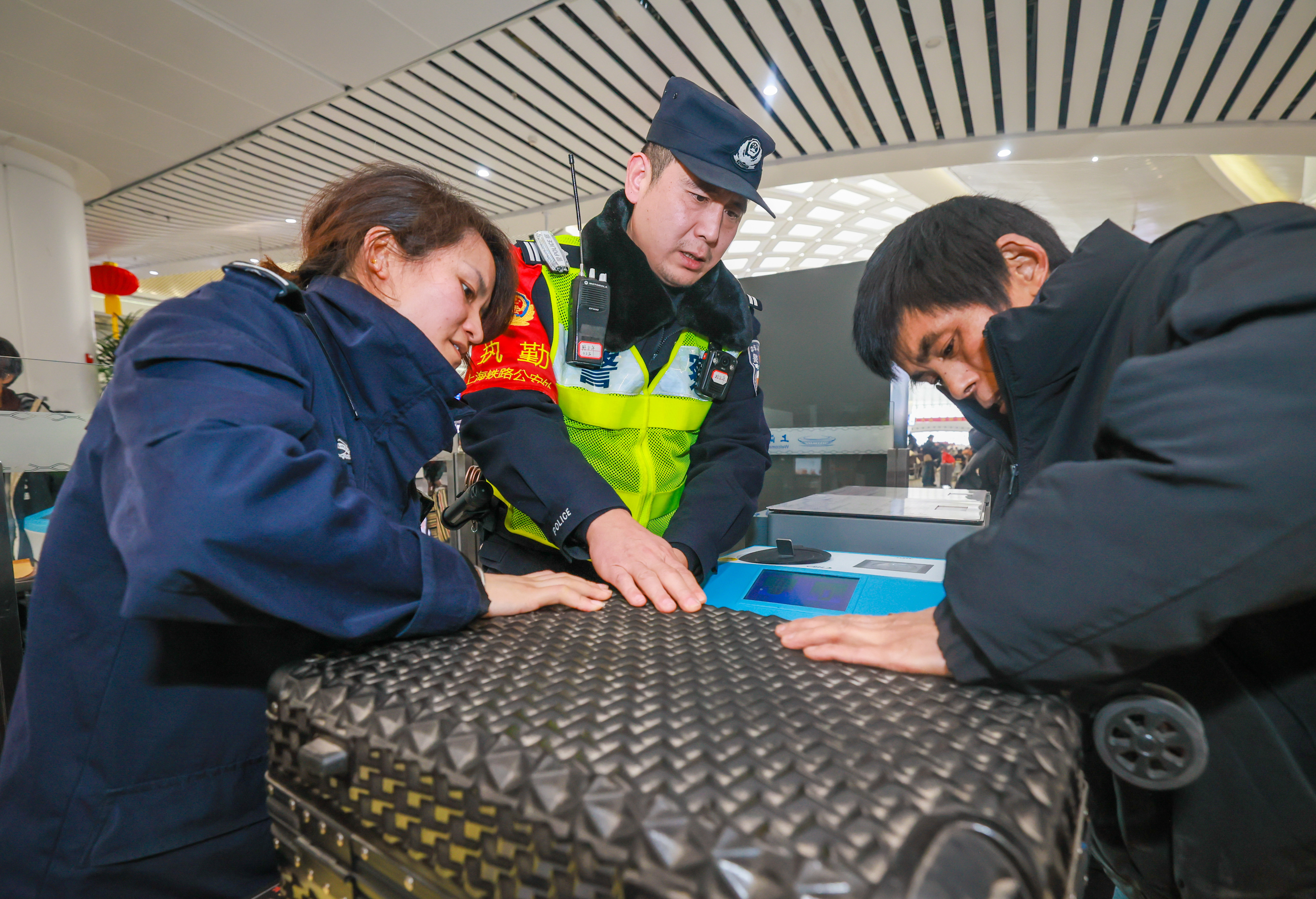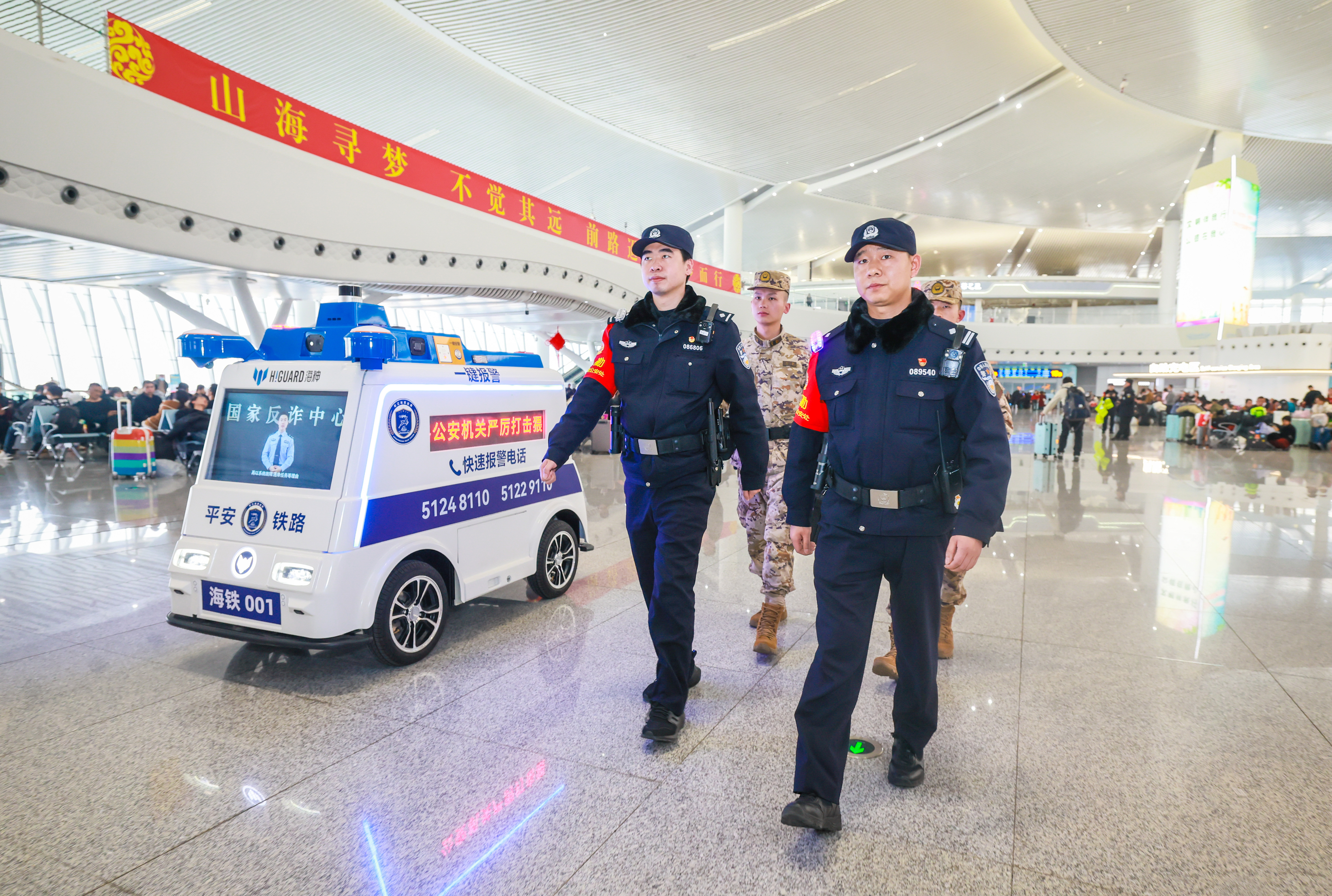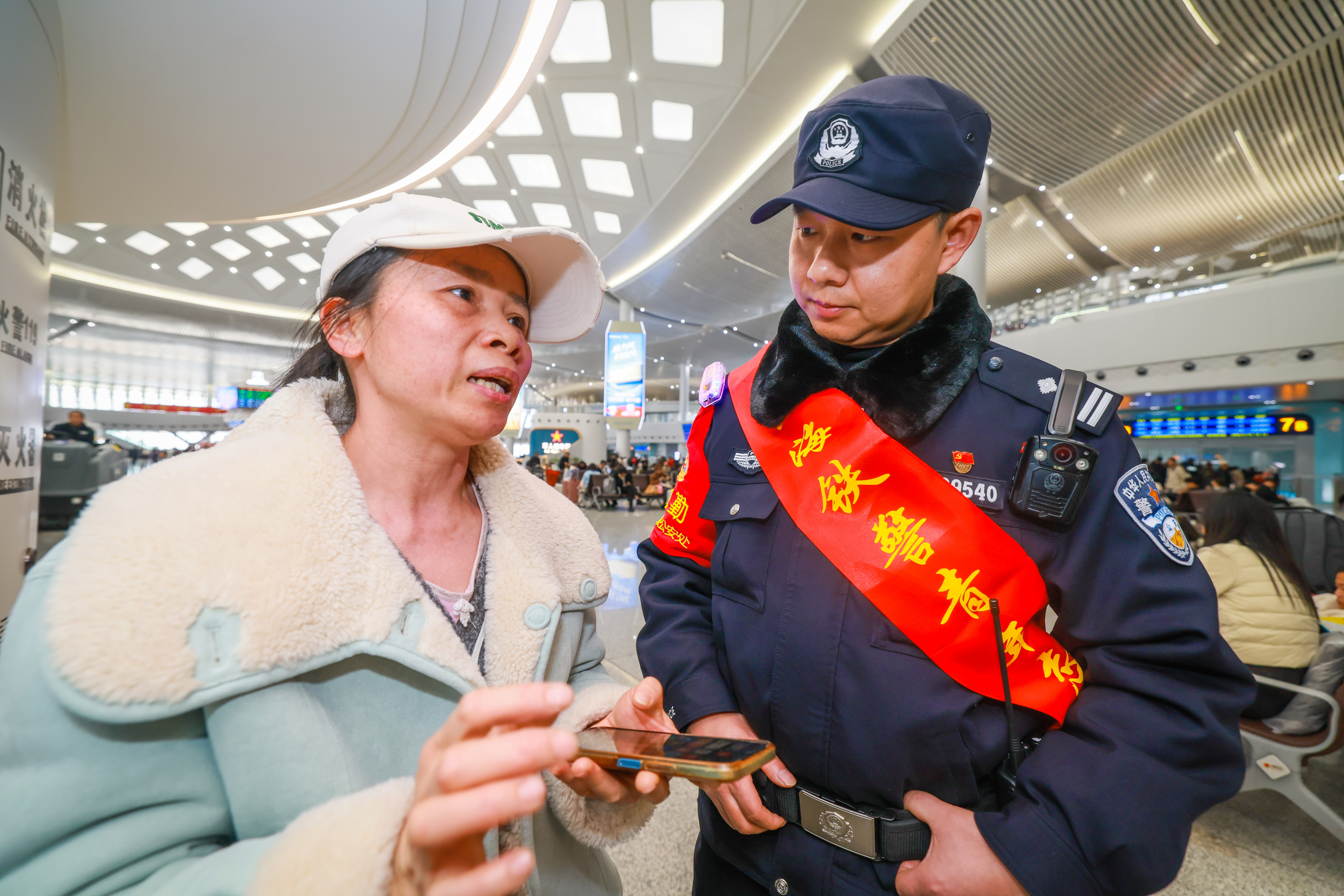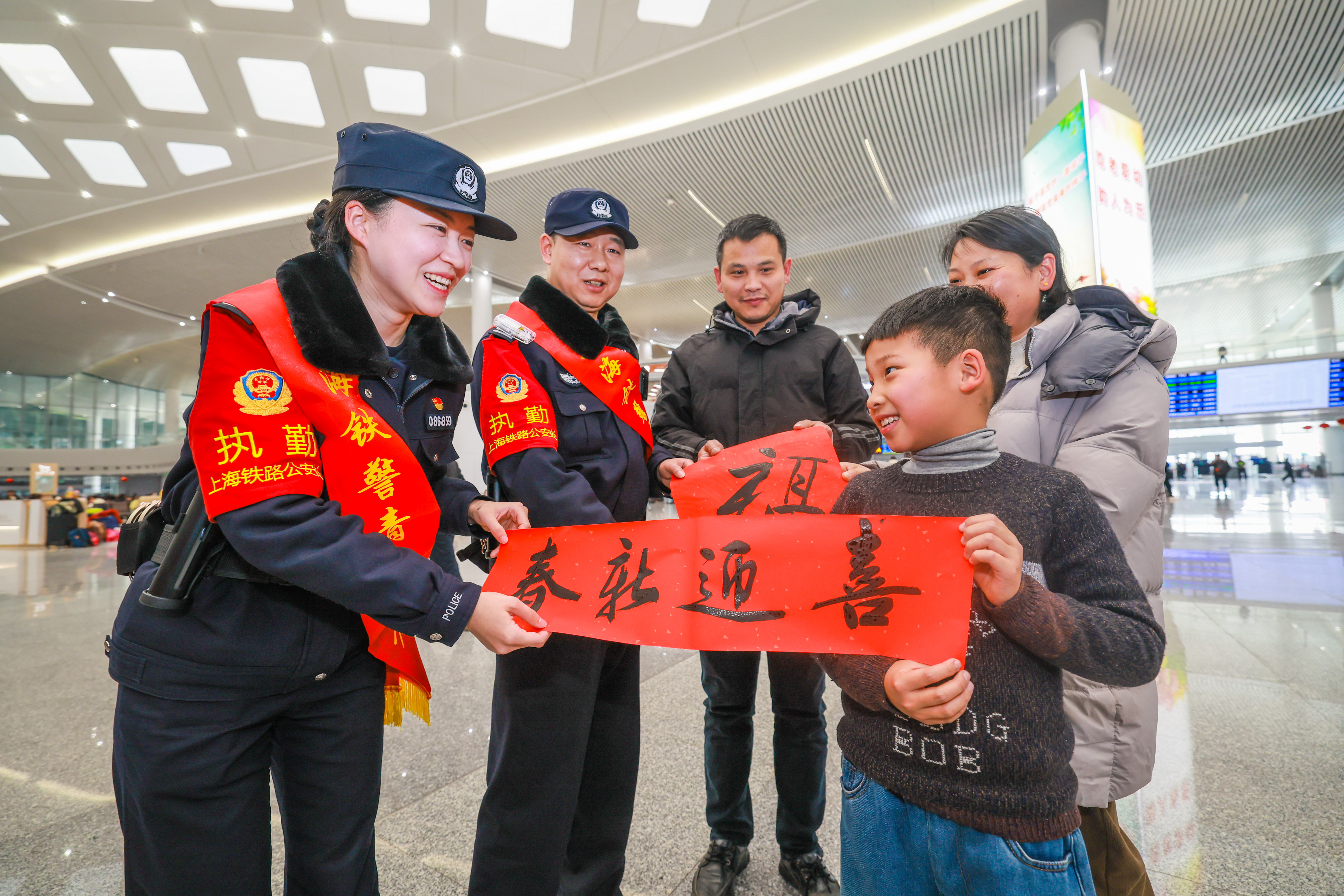 2月10日,上海松江站春运客流持续攀升。上海铁路公安处松江站派出所联合交管支队民警及武警官兵,开展春运安保值守,并与车站客运部门工作人员共同为返乡旅客送上手写春联与福字。他们以多警种协同的硬核守护与暖心服务,让平安与年味相伴旅客归途。 记者 蔡斌 摄