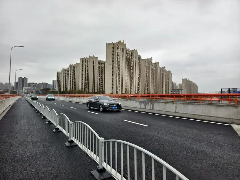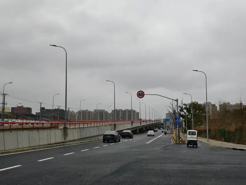 期间,宝山区建设交通委坚持民生导向,统筹协调、攻坚克难,成功克服企业腾地、上跨铁路施工、南大路口交通组织复杂、45米大跨度钢混叠合梁架设等施工难题,于2026年2月6日全面完工并正式通车。从此,沿线居民将告别南秀路铁路道口,机动车及非机动车可通过主线跨线桥实现环镇南路至丰皓路双向通行,行人可由跨线桥两侧的人行梯道实现跨铁路段通行。