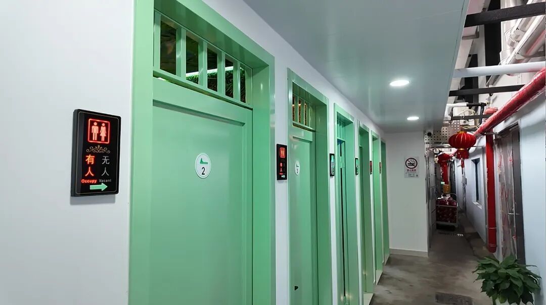 记者注意到,和一般公厕相比,泰康路210弄9号公厕设有6间无性别厕位和1间无障碍家庭卫生间。步入公厕,绿色的主色调给人一种清新自然的感受;每一个厕位门的左上方都配有显示“有人、无人”的电子标识牌,让使用者对厕位使用情况一目了然;此外,厕位数字标识旁还用蹲厕、坐厕用于区分,极大提升了使用者的体验。